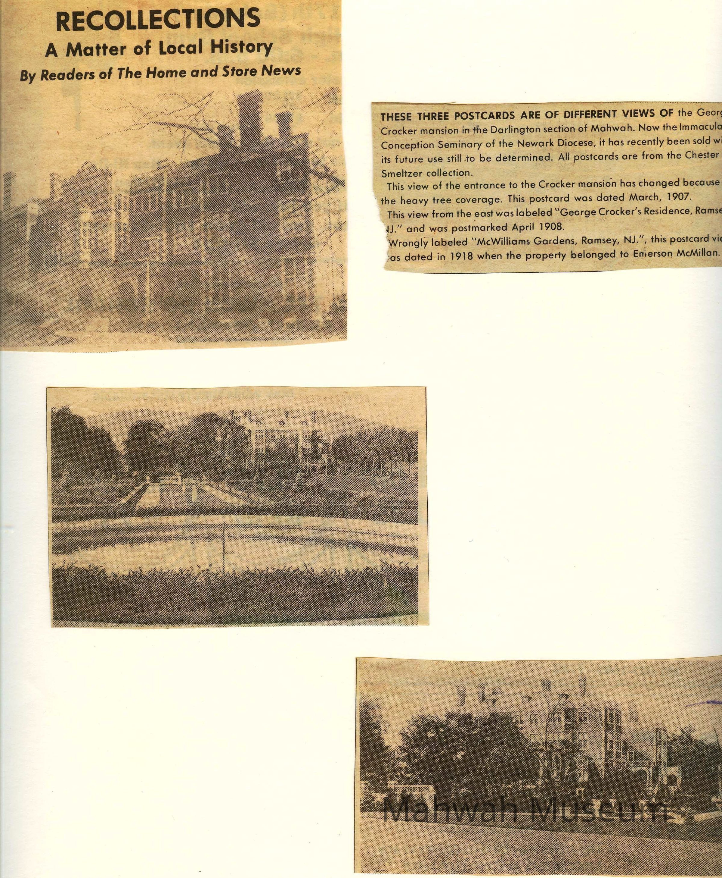 Photos of three postcards with different views of the George Crocker Mansion in the Darlington section of Mahwah (Home and Store News). Entrance to the mansion in March, 1907. View of the mansion from the east in April, 1908. Photo wrongly labeled as "McWilliam Gardens, Ramsey, NJ" from 1918 when Emerson McMillin owned the property. Personal collection of letters, photos, and other documents of Isabel Hudson.Photograph Details
