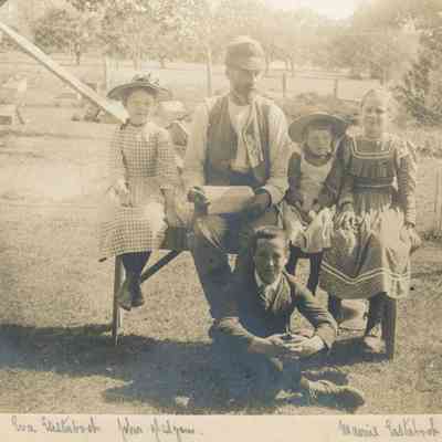 John Glasgow seated with Eva Estabrook, Mamie Estabrook, Montee Glasgow and another child by the Havemeyer chicken coops.Photograph Details