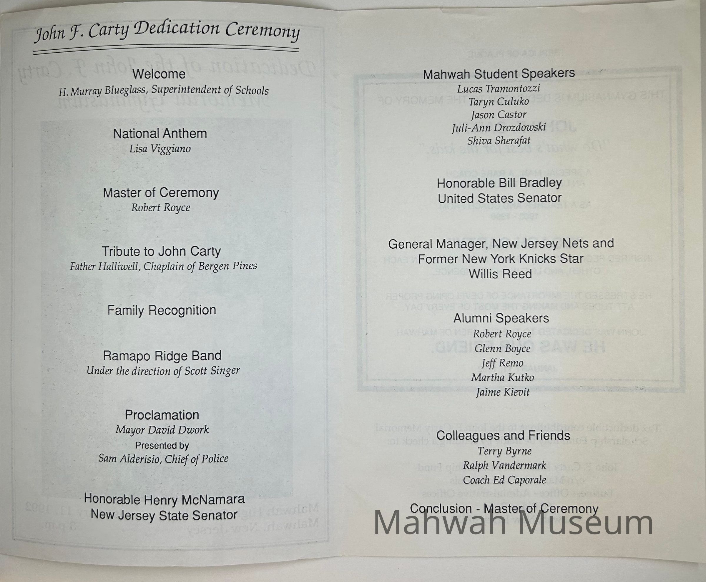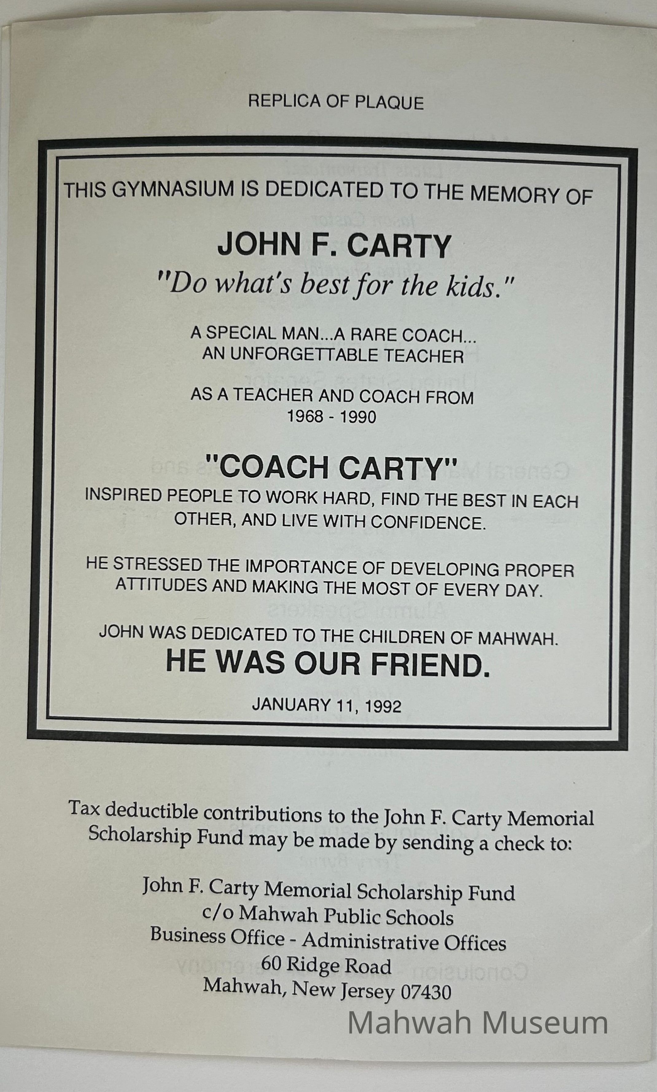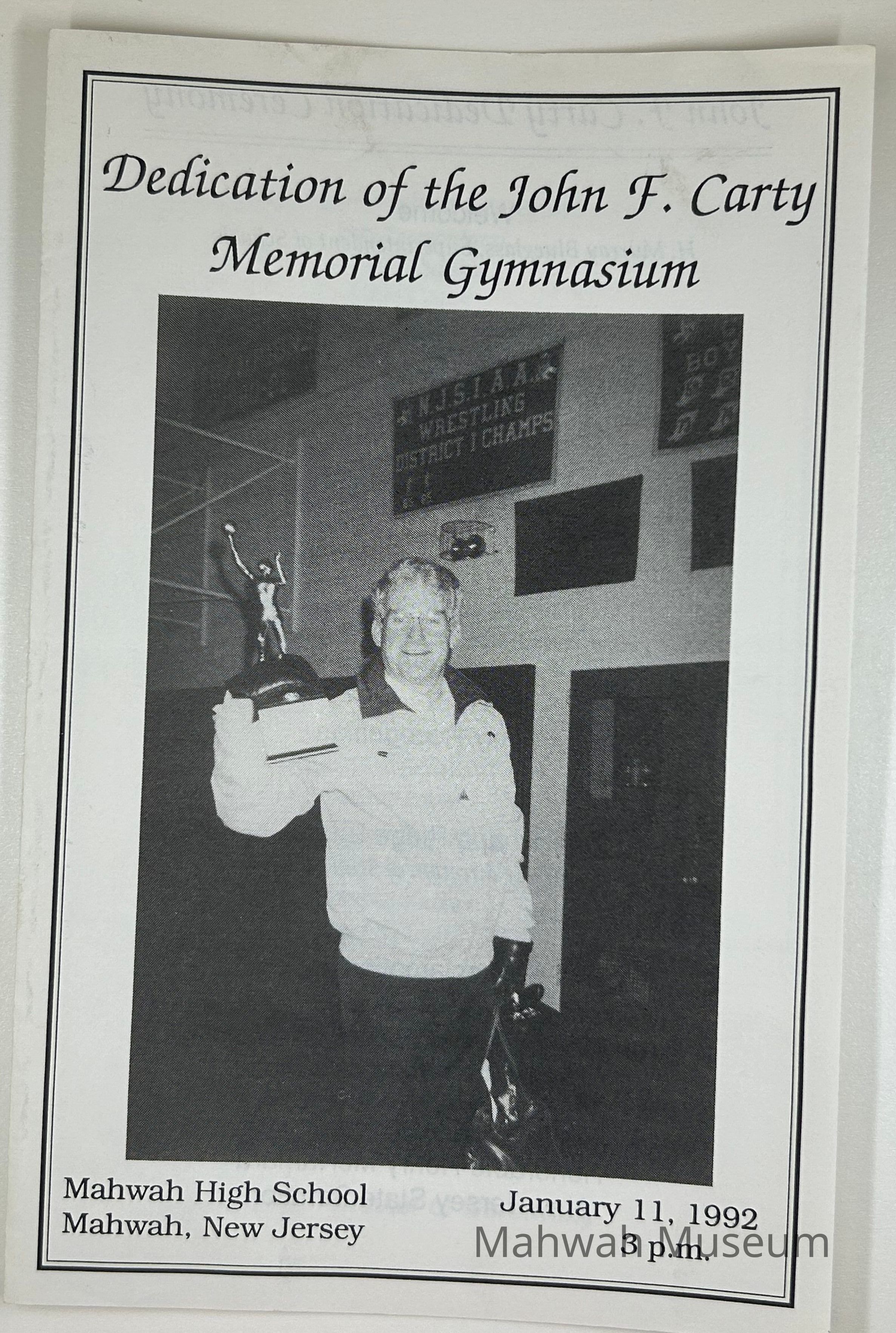 A pamphlet describing John F. Carty and the dedication of the Mahwah High School Gymnasium in his honorCollection