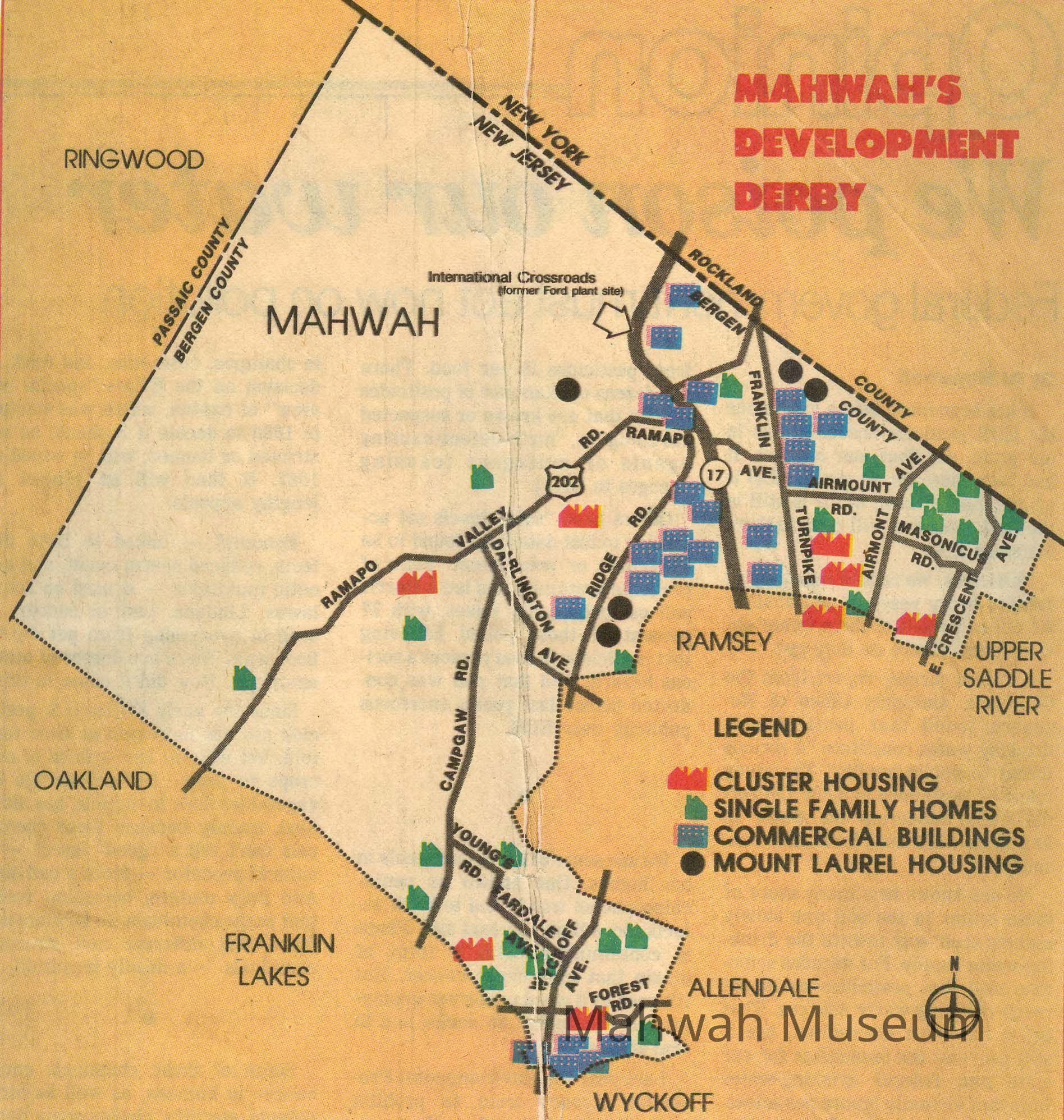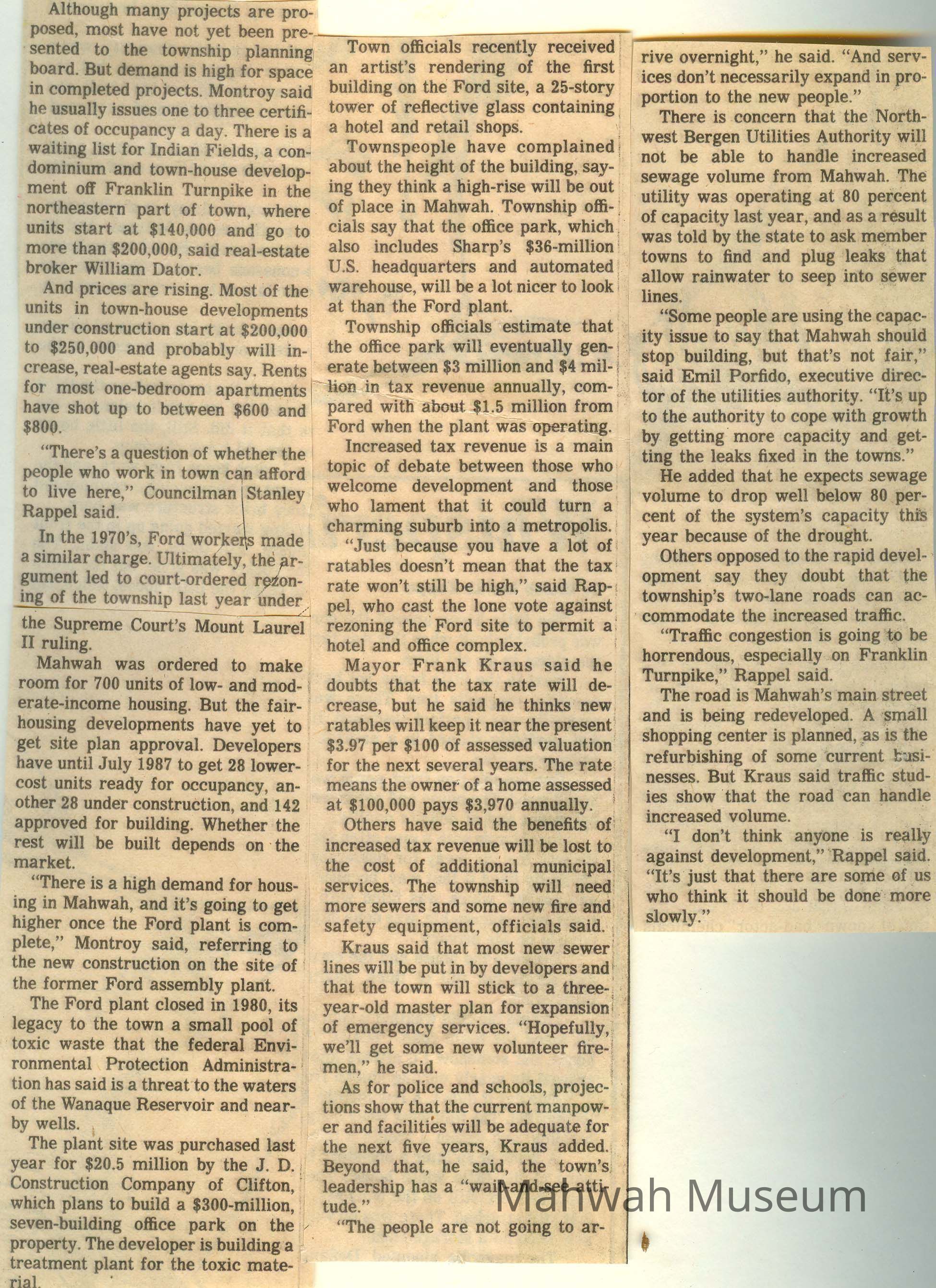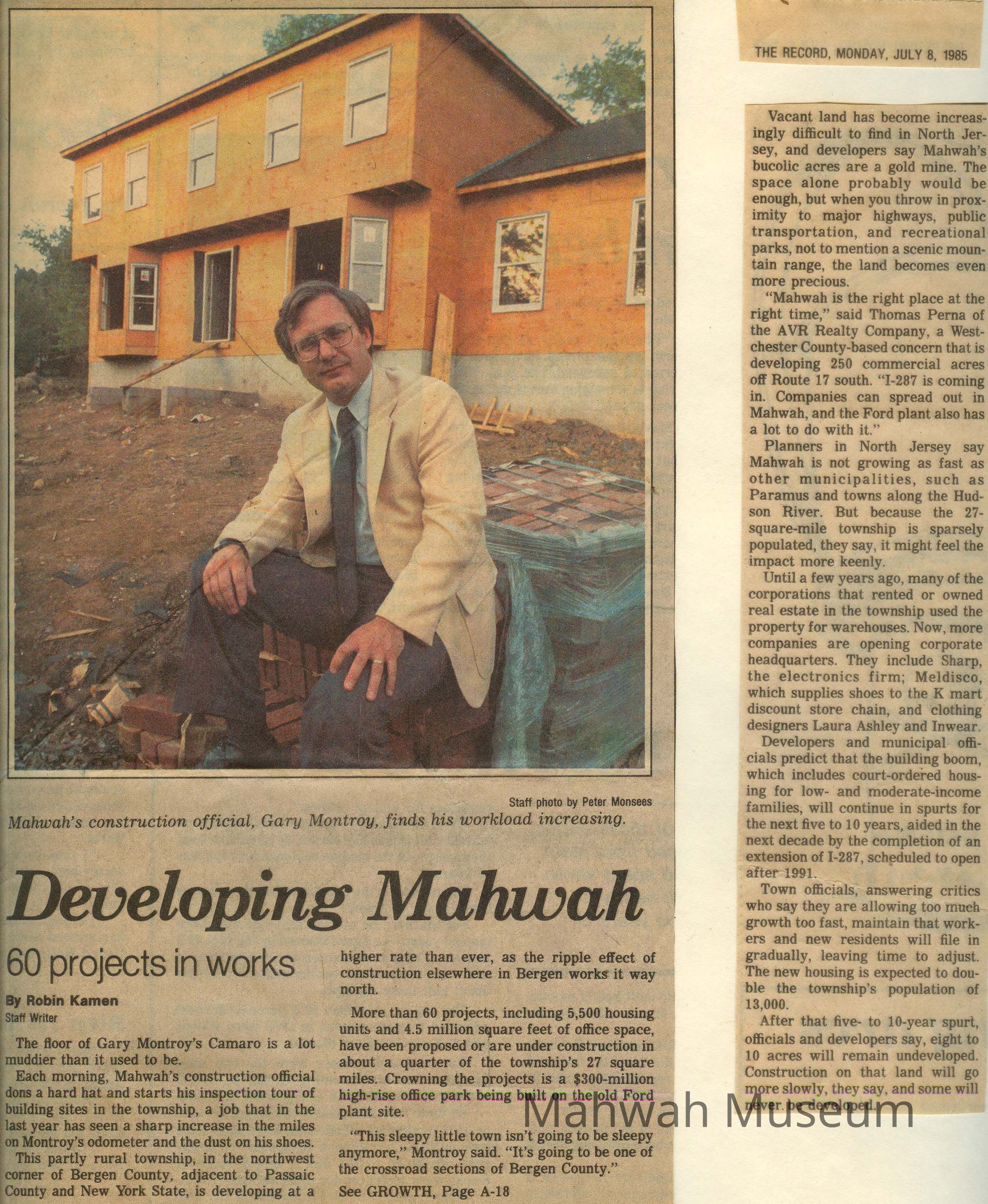 The Record clipping: "Developing Mahwah" by Robin Kamen from Monday, July 8, 1985. Personal collection of letters, photos, and other documents of Isabel Hudson.Collection
