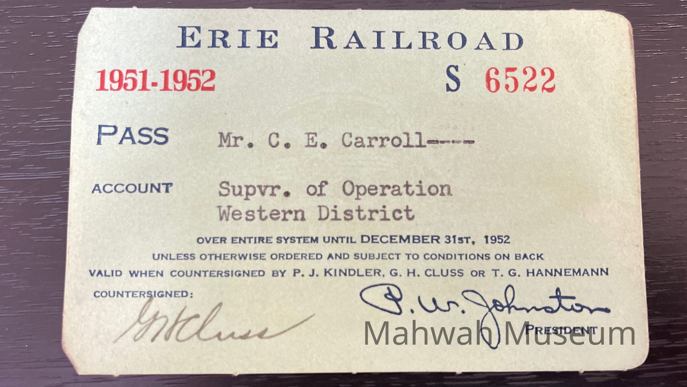 A pass for the Erie Railroad for Train Dispatcher C. E. CarrollCollection