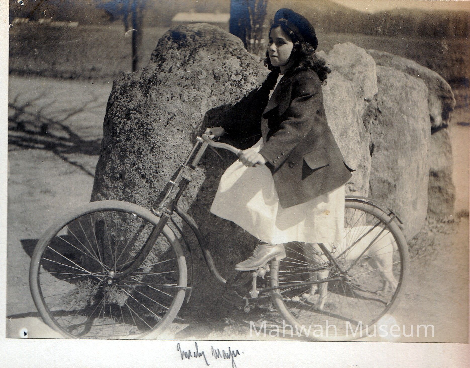 Emily Mayer riding a bike in Mahwah with a large stone wall behind.Photograph Details