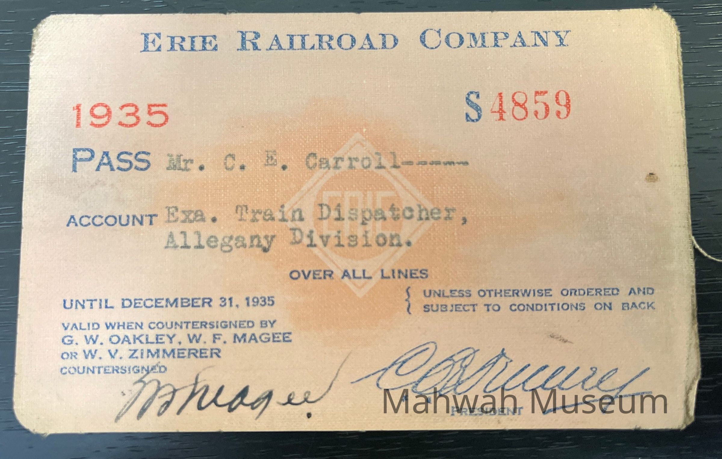 A pass for the Erie Railroad for Train Dispatcher C. E. Carroll