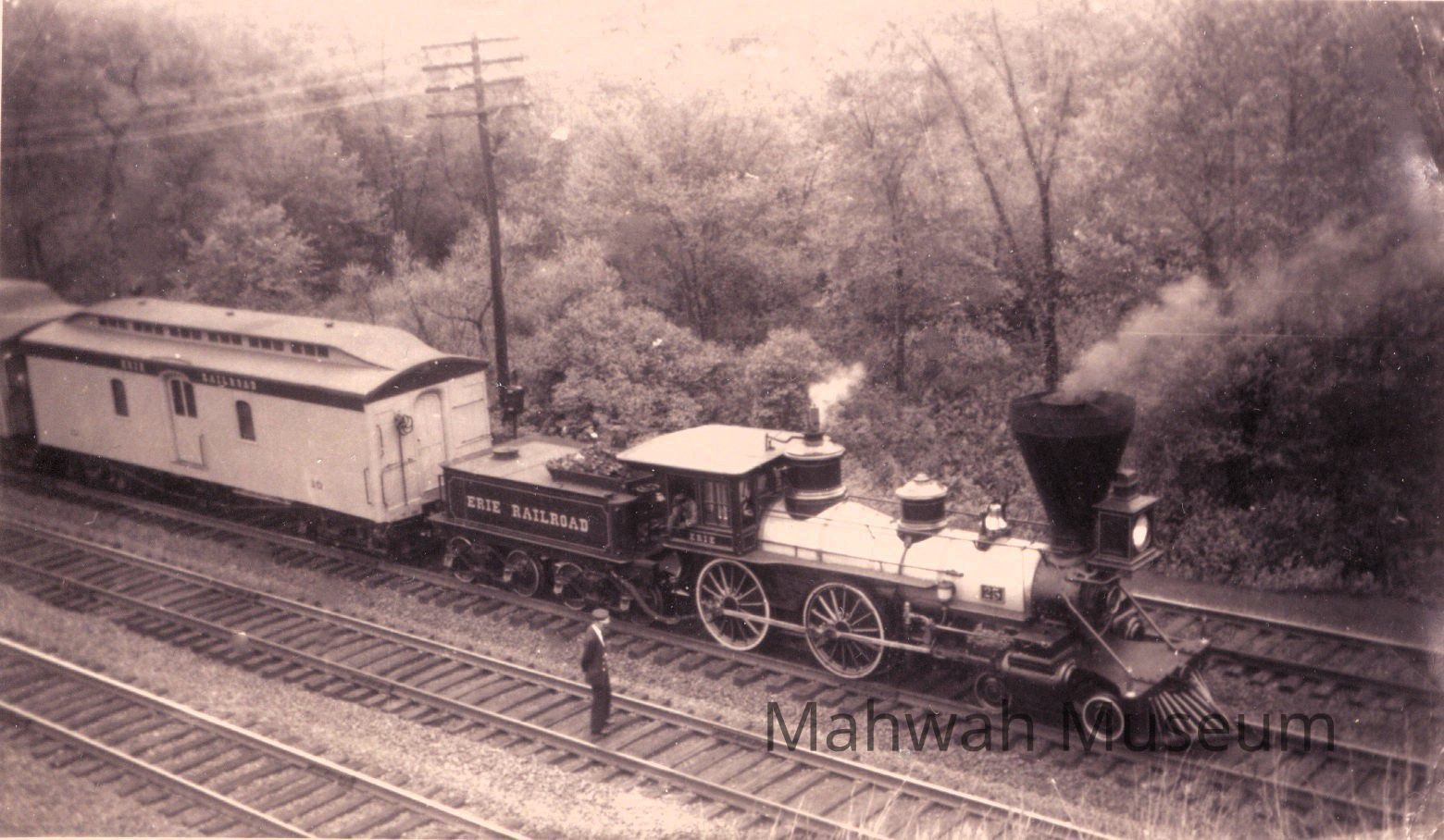 Photograph of the Erie Railroad's Centennial Train at the Rt. 17 overpass on the border of Ramsey and Mahwah. The steam locomotive is a 4-4-0 wheel arrangement.