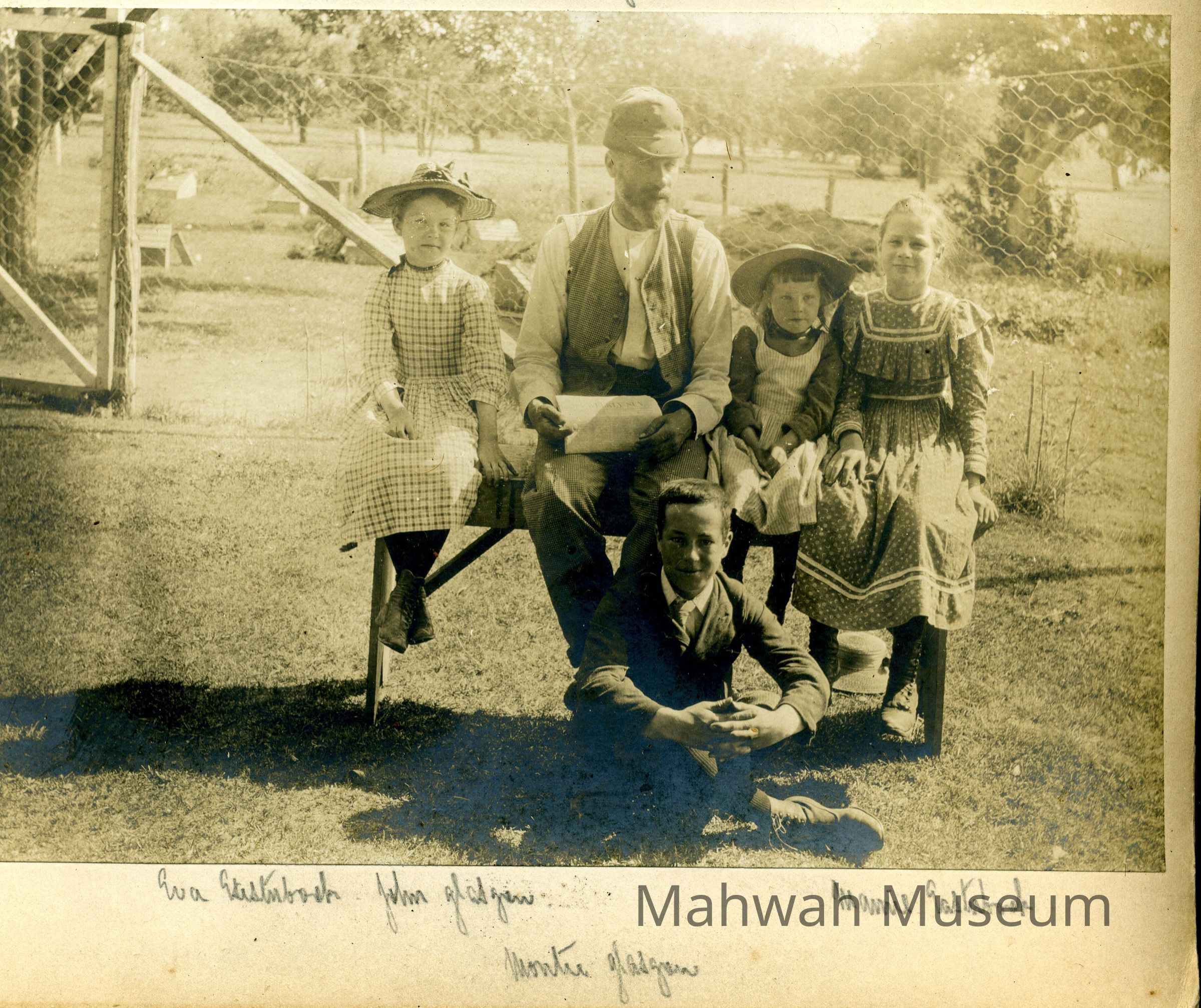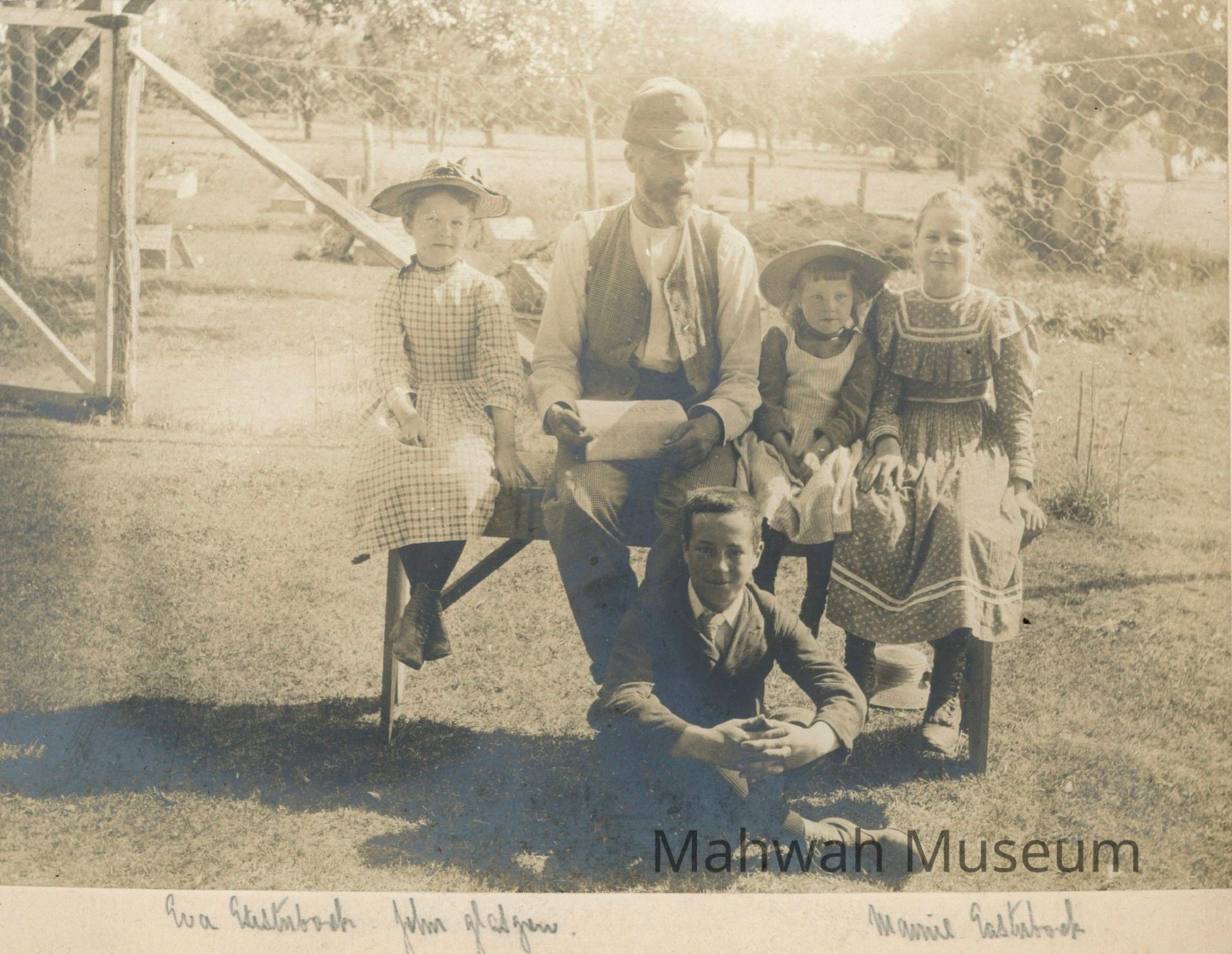 John Glasgow seated with Eva Estabrook, Mamie Estabrook, Montee Glasgow and another child by the Havemeyer chicken coops.Photograph Details