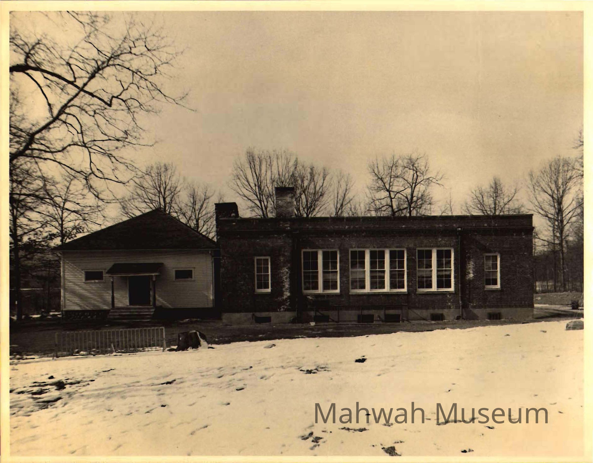 1950s black and white photograph of George Washington School (11x14) with one-room schoolhouse attached. Additional 11x14 copy printed on lesser-quality paper also a 4x5 black and white negative. Printed in 1988 by QPL Photographics.Photograph Details