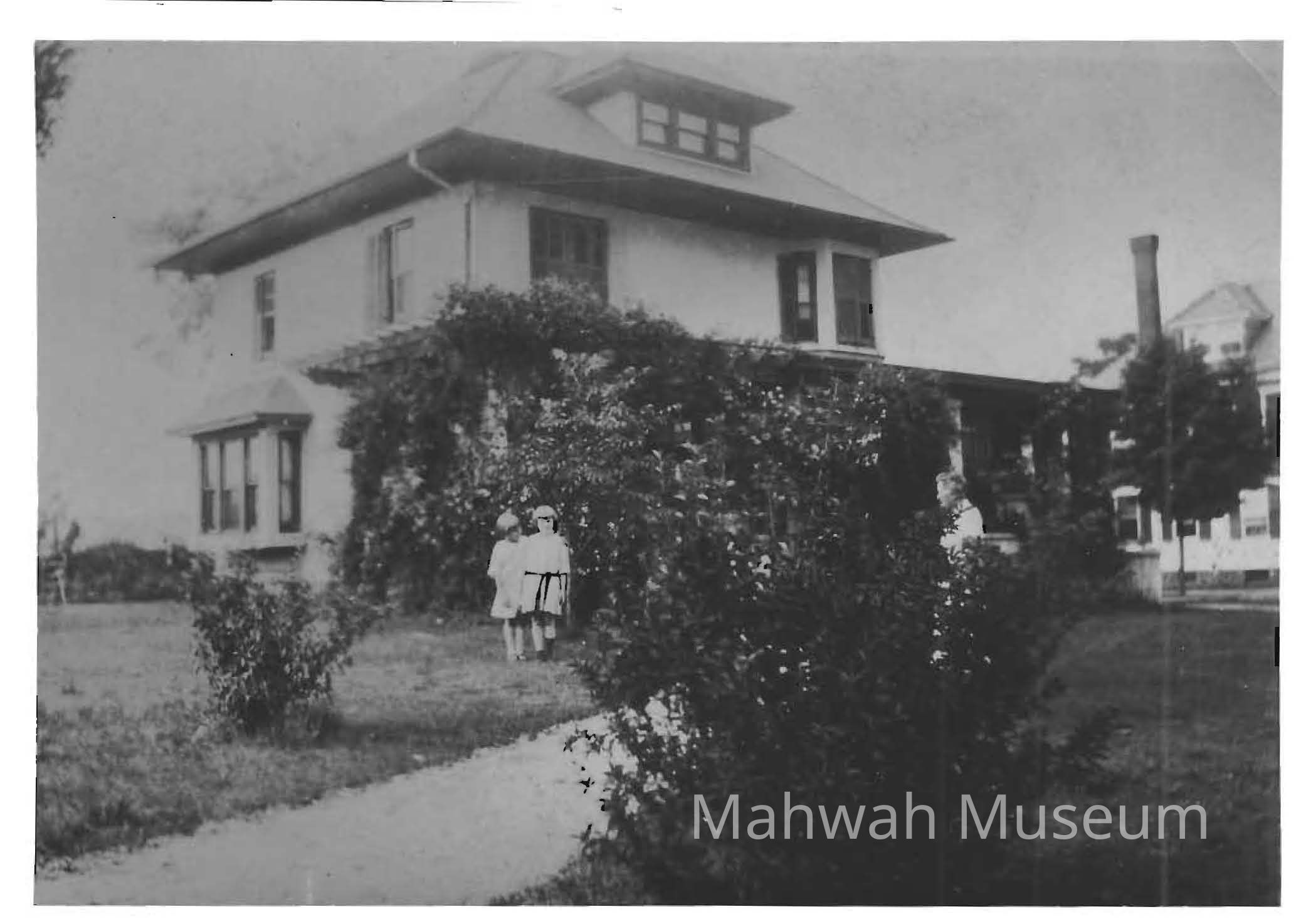 Black and white photograph of Ratie Winter's house on E. Ramapo Ave (5x7). Two girls and a man or woman stand on the front lawn. Collection of B. Zisgen.Photograph Details