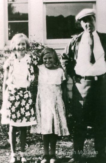 Virginia May Furman, Helen Malishewski, and Harry Furman in front of Furman Valley Rd home in Mahwah. Helen's parents bought the river lot next to grist mill site from Hopper (Furman's grandfather.) Later used for Ford Union office . Bill Dromesh bought the two adjoining lots running to south Street. Furman home was same as Mark Restaurant home.