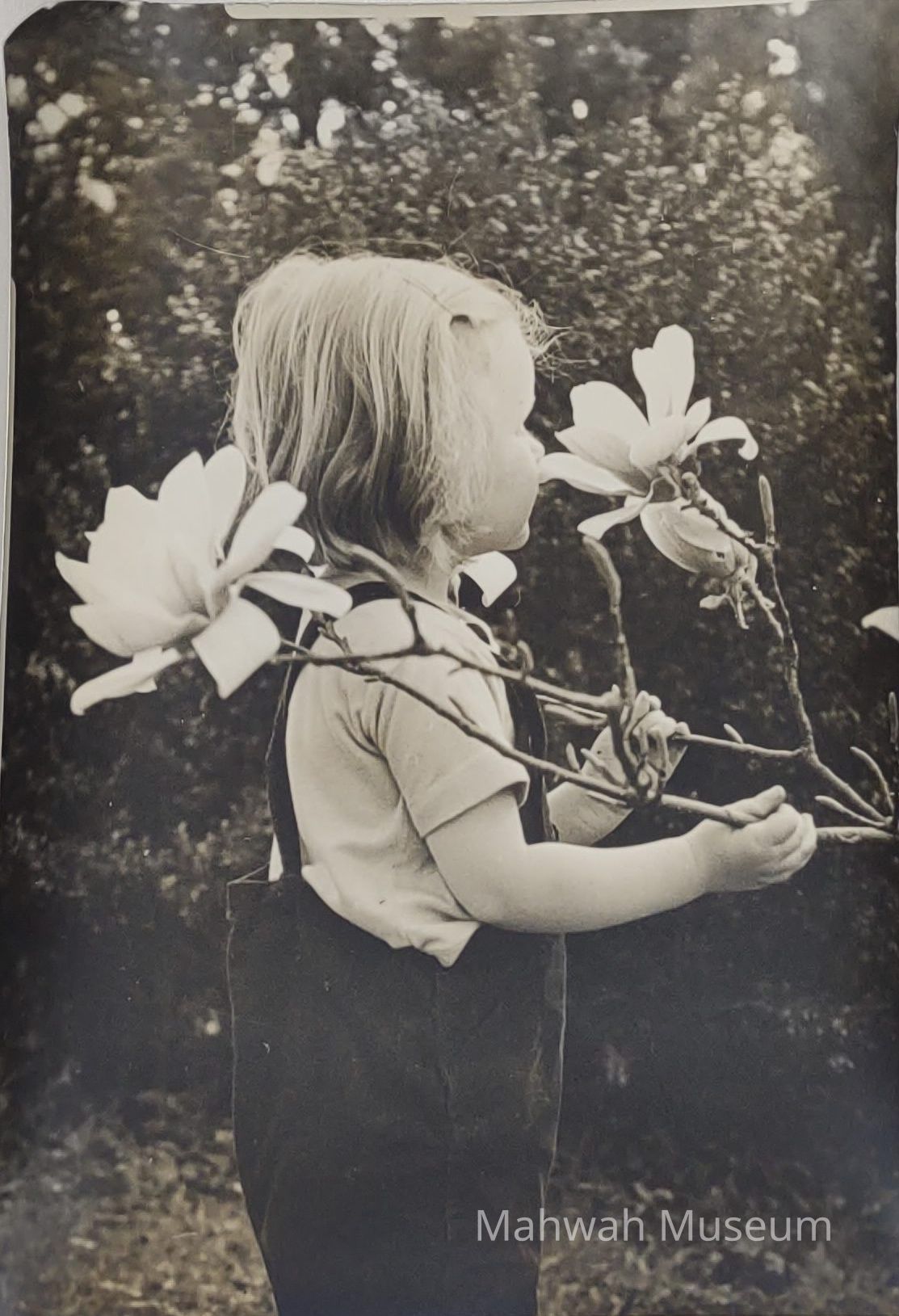 A young girl in overalls sniffs flowers. It might be one of Howard Avery's daughters, Mary or Byrd.