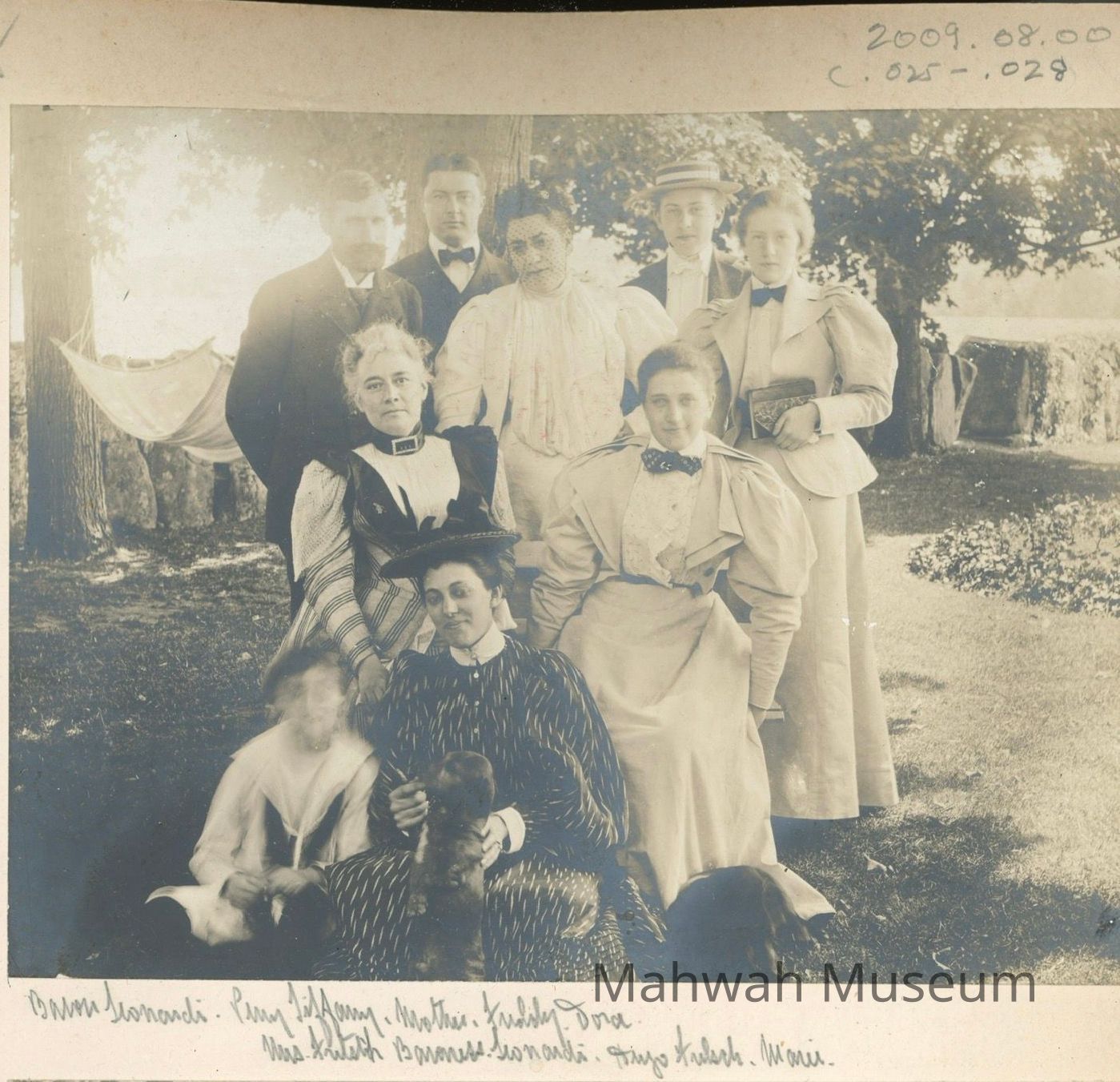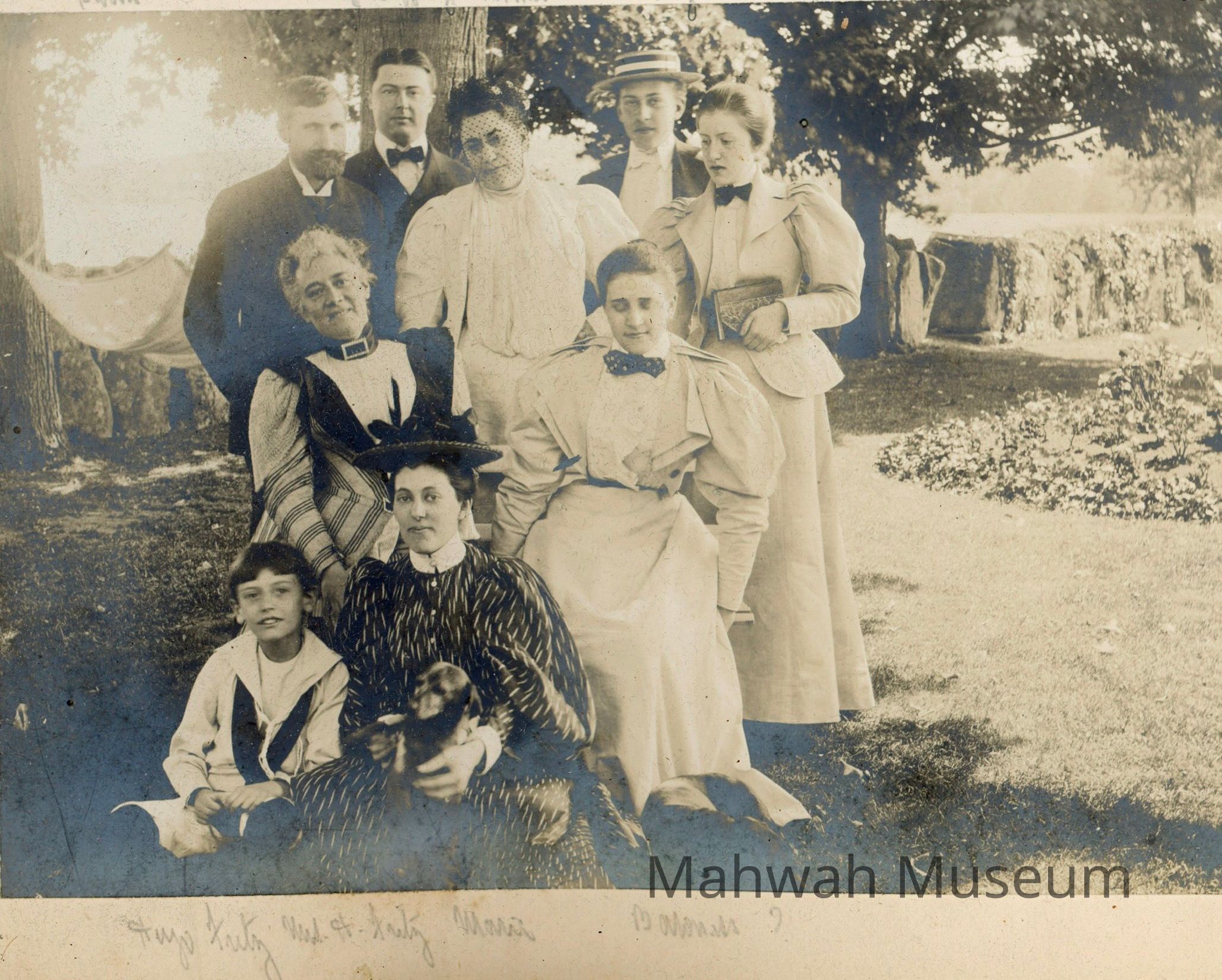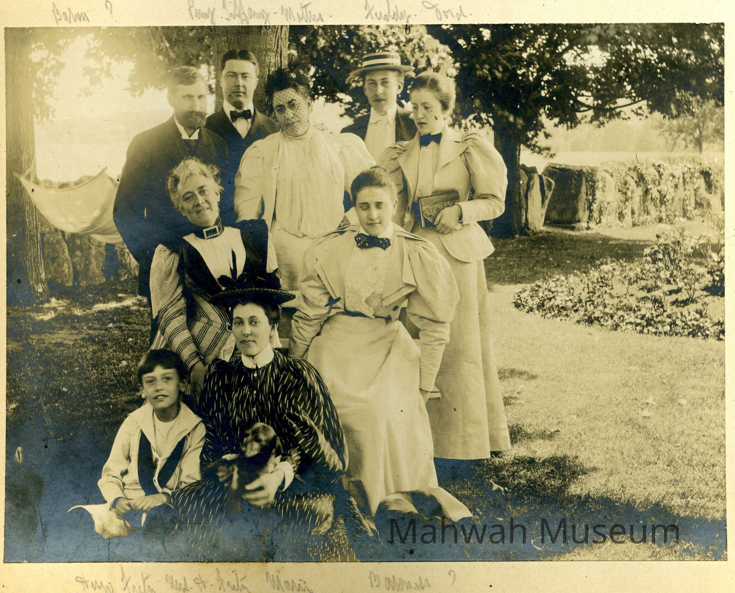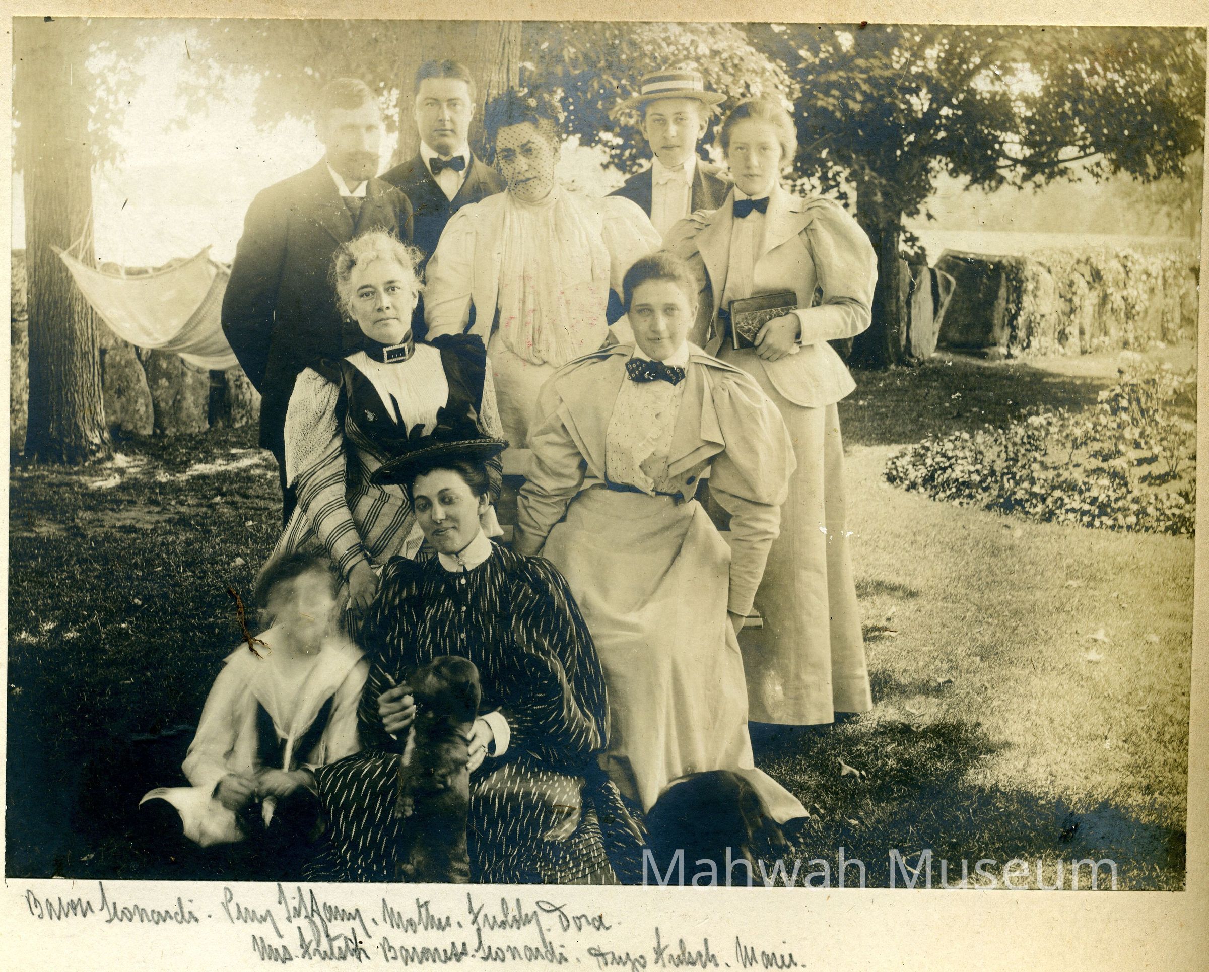 Photograph of a group of Havemeyers and friends, including top row: Baron Leonardi, the Austro-Hungarian Consul, Perry Tiffany, husband of Marie Havemeyer, Emily DeLoosey Havemeyer, Frederick Christian Havemeyer, Theodore Havemeyer Winslow; seated in center, Mrs Fritz and Baroness Leonardi; on ground, Hugh Fritsch and Marie Havemeyer Tiffany.Photograph Details