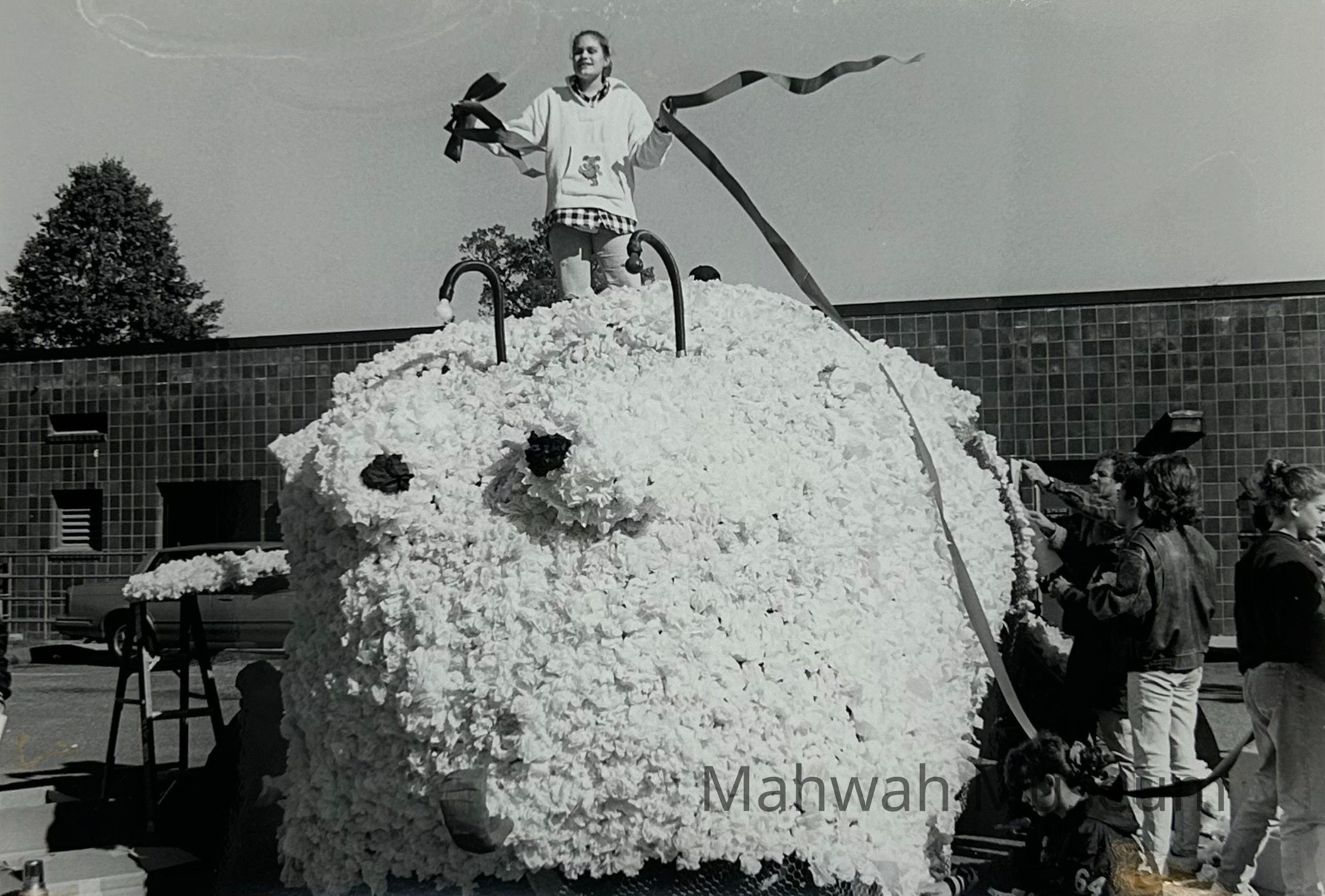 Photo taken by Lee Vold of a student who decorated her car for the car decorating contest for Mahwah football homecoming. The student (Nina Goviz) won 1st place for the sophomores in this contest on Saturday, October 23, 1993.Photograph Details
