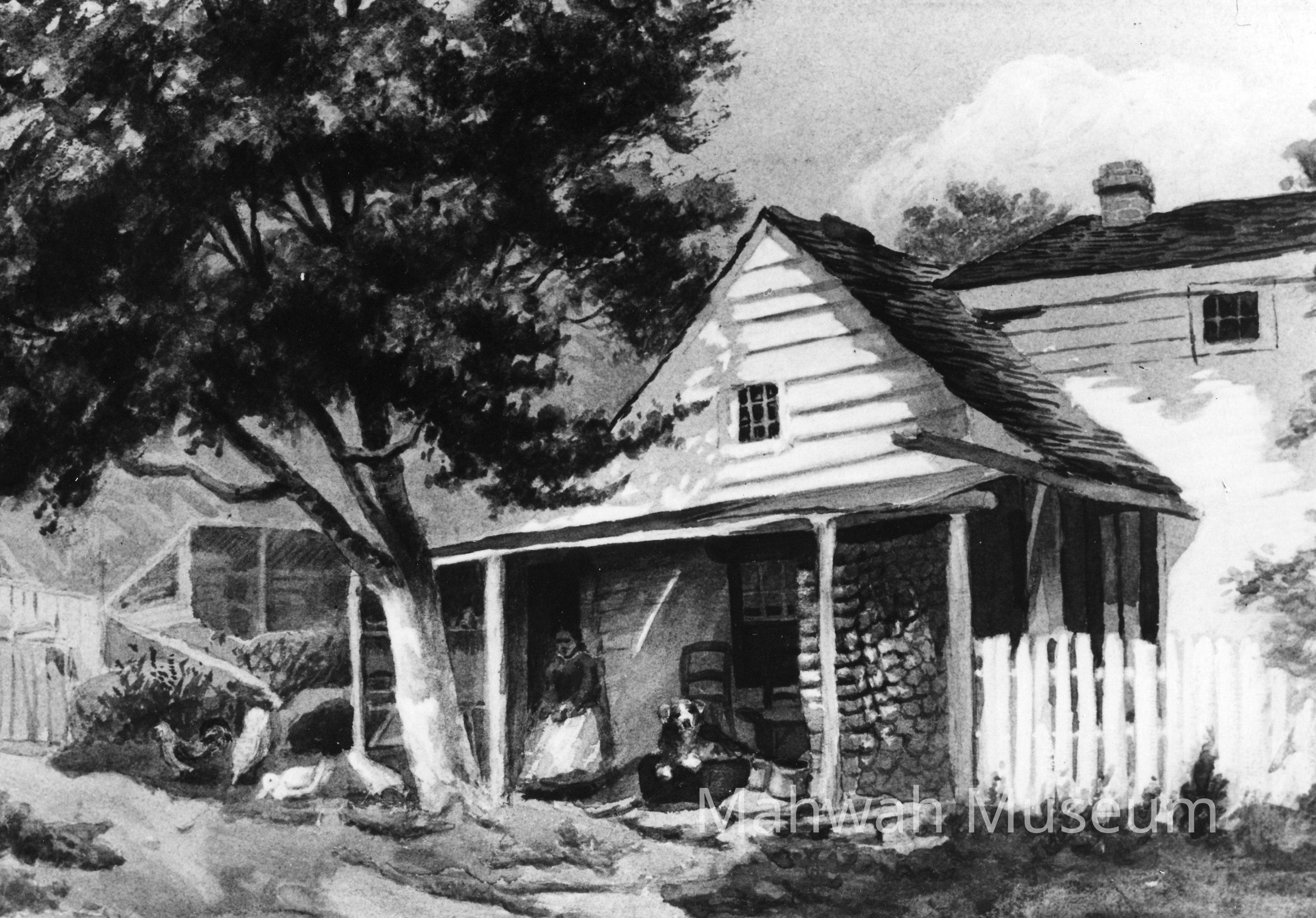 Sam Jennings House which stood north of the Halifax Road and east of Havemeyer reservoir. The Grandmother of Lloyd Jennings of N.Railroad Avenue is on the porch. Picture from a watercolor by a daugher ot T.A. Havemeyer.The Jennings and some Mountain people worked for Mountain Side. Bischoff, page 144. Natalie Havemeyer left a bequest to Sam Jennings in her will. Bergen County Wills. Lloyd Jennings whose grandmother is shown on this porch was a pitcher in the 1920's for the Mahwah Tigers, a semipro team. He was offered a position on a Brooklyn professional team but turned it down. Bischoff page 242. Lloyd Jennings recalled that H.O. Havemeyer decided to move people out of Green Mountain Valley (Havemeyer Hollow). Gave his father (who had been an employee on the Havemeyer estate) $5.00 to move out. The frame church in Havemeyer Hollow was dissassembled and moved to Grove Street as the AME Zion congregation. Bischoff page 247Photograph Details