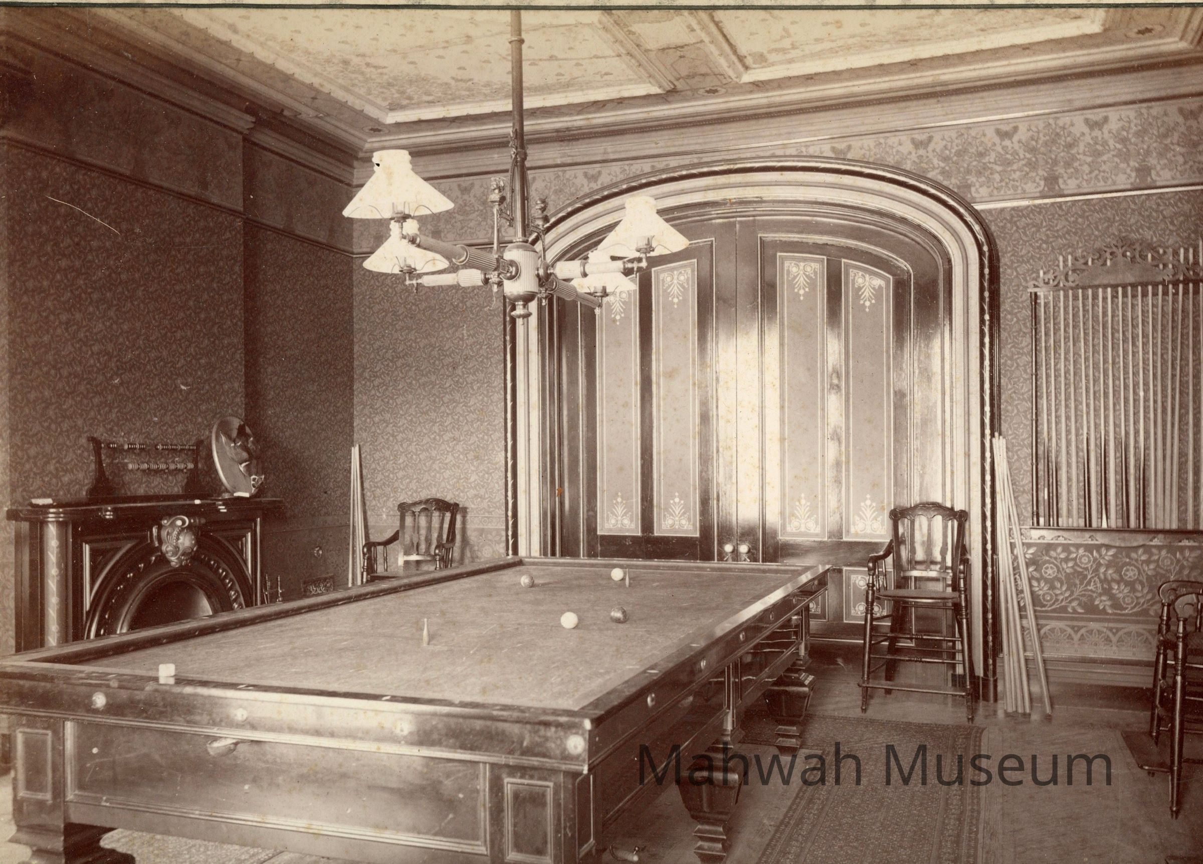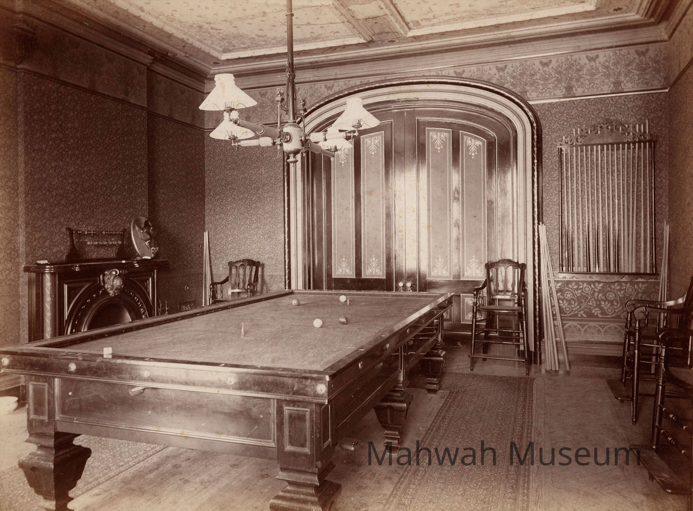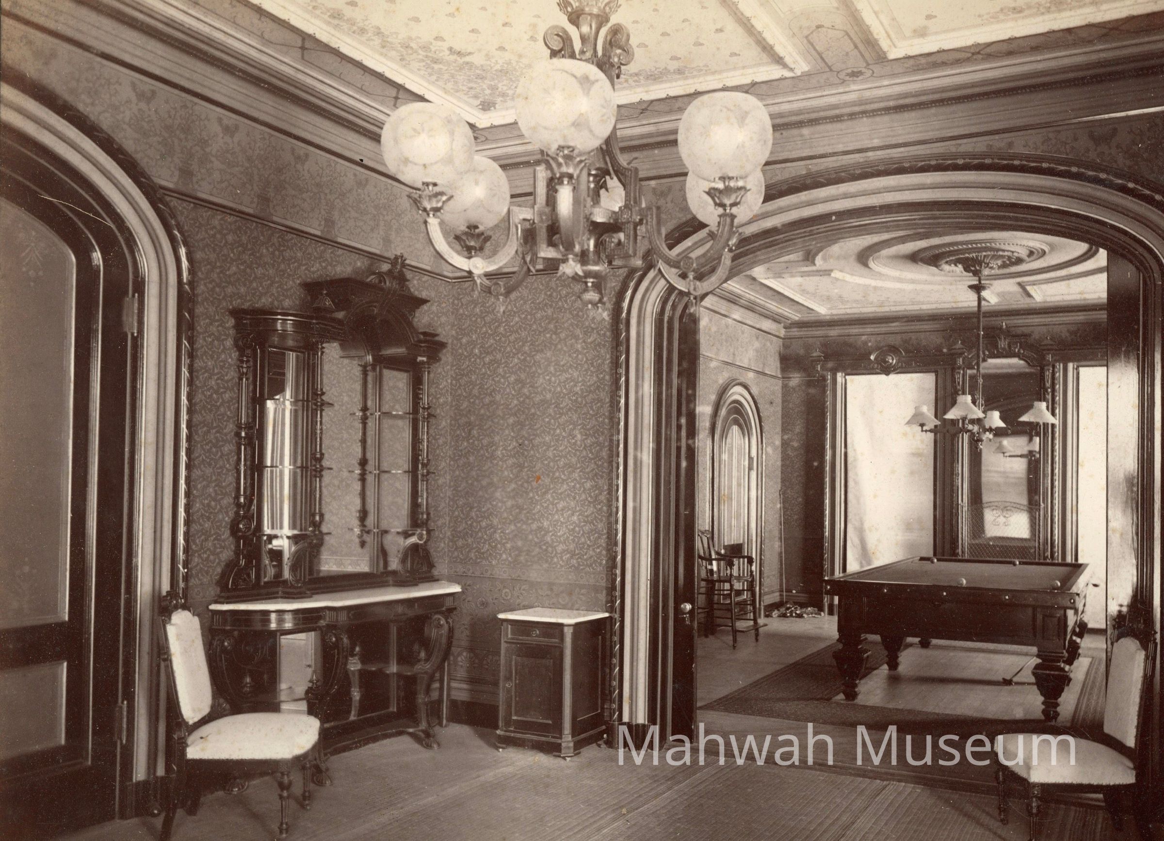 Interior rooms, bedroom dining area, and billiard room in the Havemeyer House