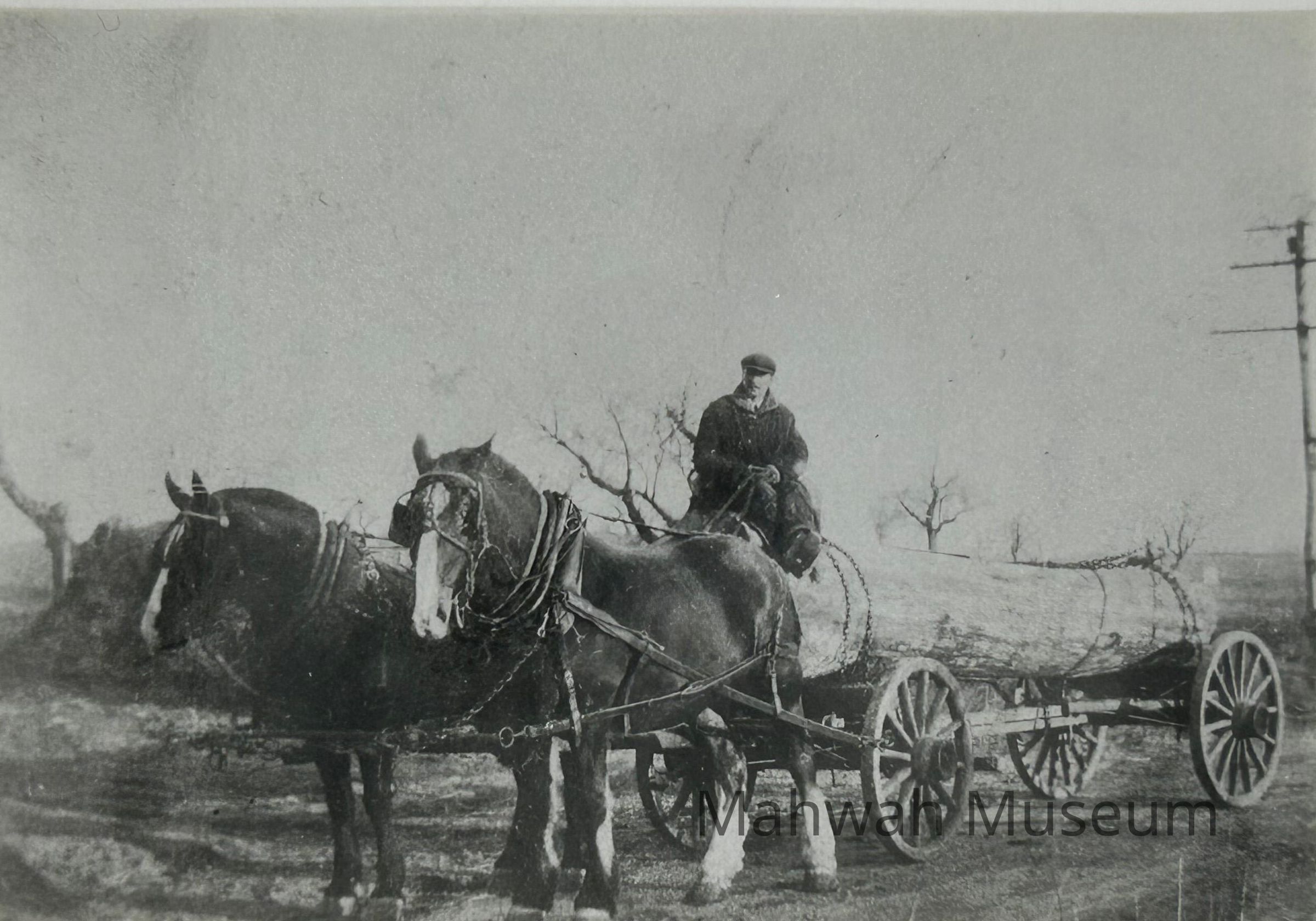 A photograph of John Storms and his team of horses pulling a large tulip tree log, circa 1918Photograph Details