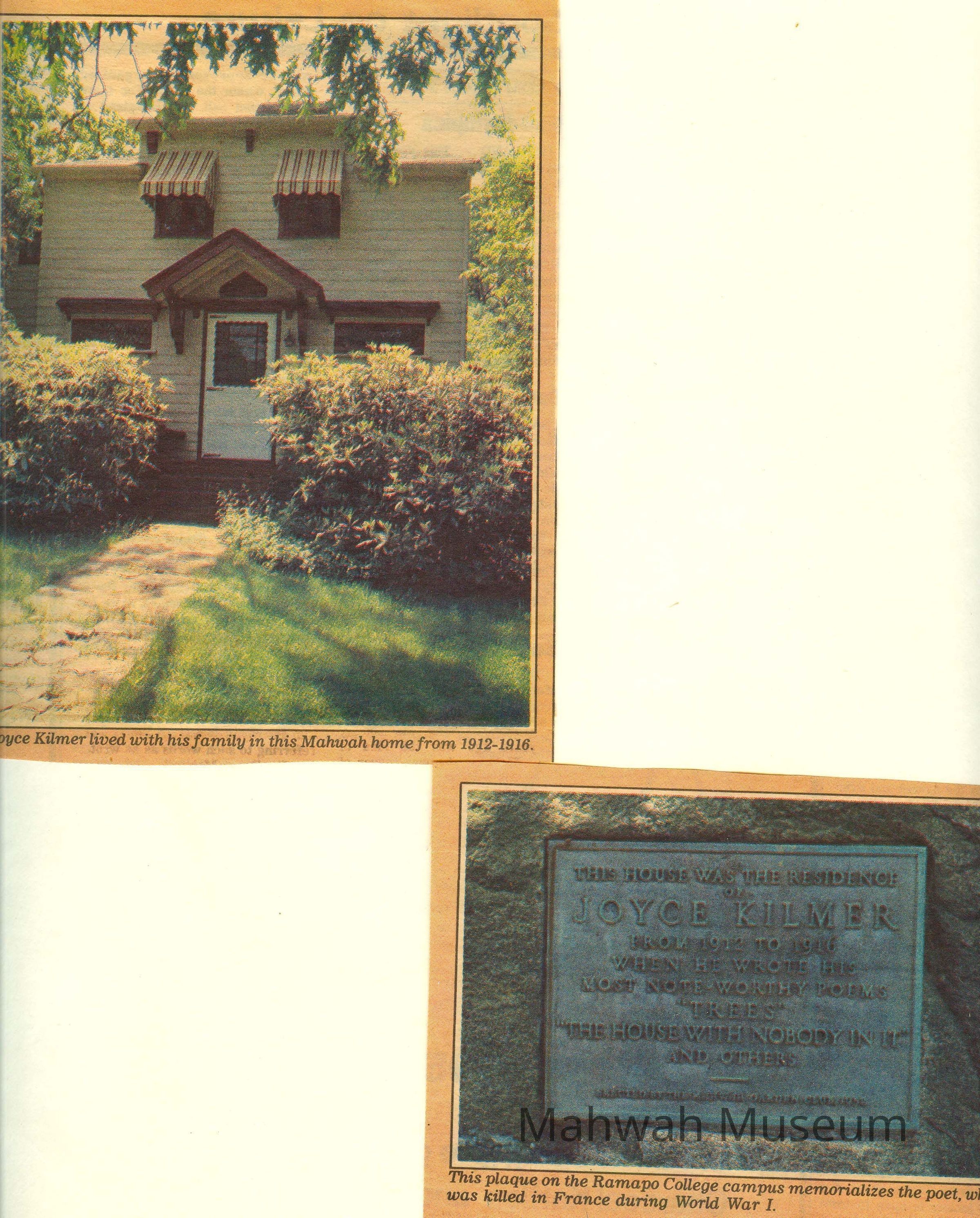 Newspaper clippings with photots of Joyce Kilmer's house and plaque. Personal collection of letters, photos, and other documents of Isabel Hudson.Photograph Details
