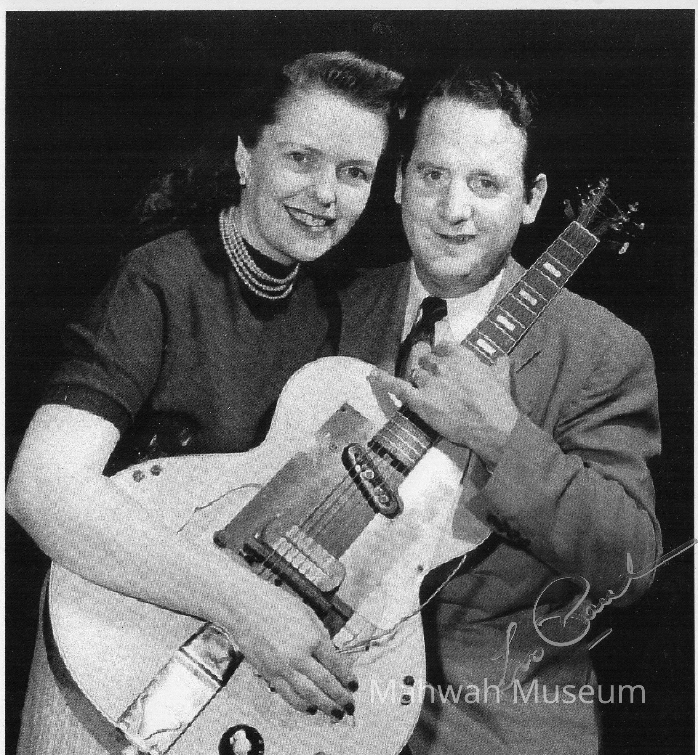 Black and white photo of Les Paul and Mary Ford with a guitar