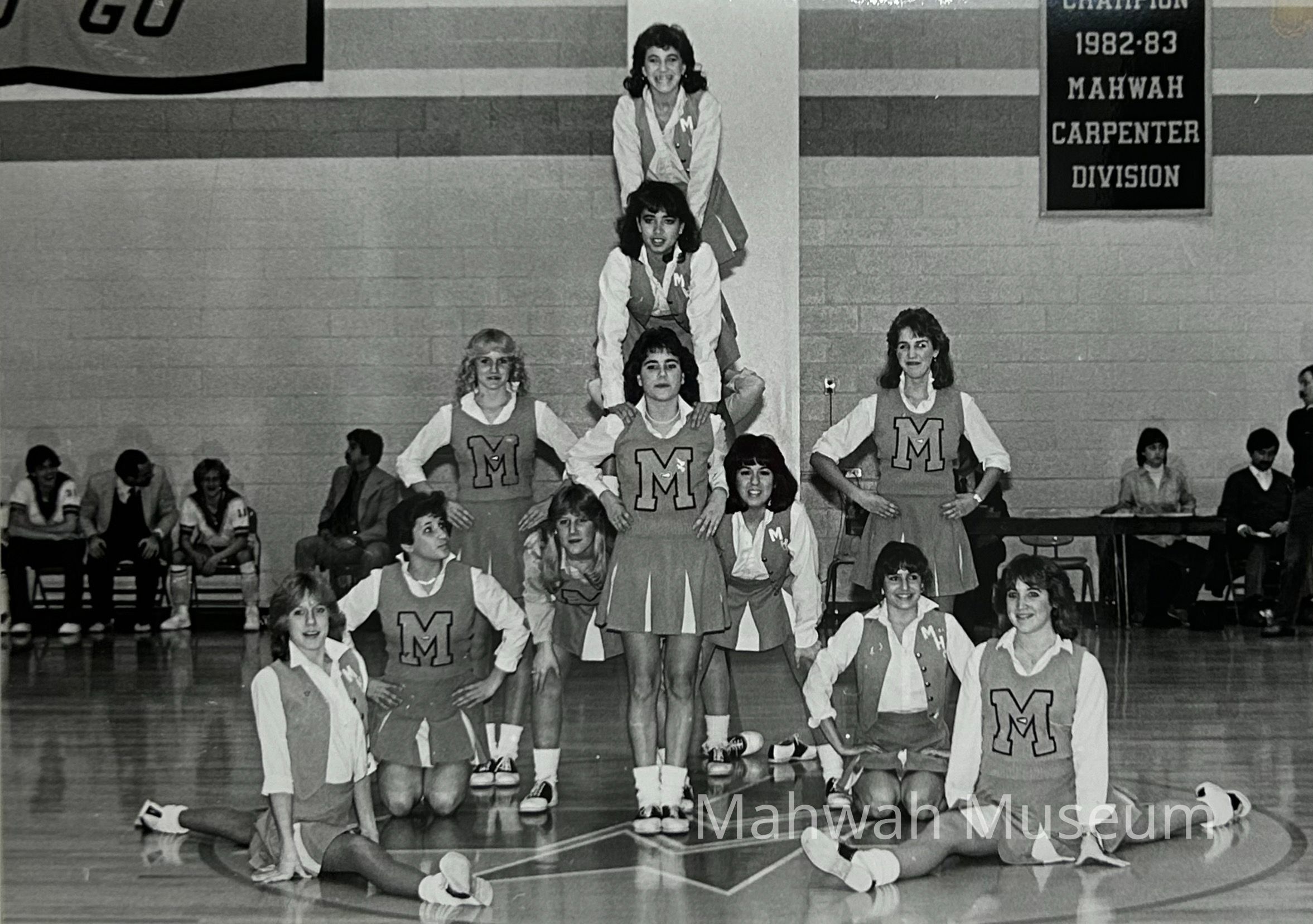 Photo taken by Lee Vold of Mahwah High School cheerleaders at the Mahwah vs. Midland Park game, taken February 1, 1985.Photograph Details
