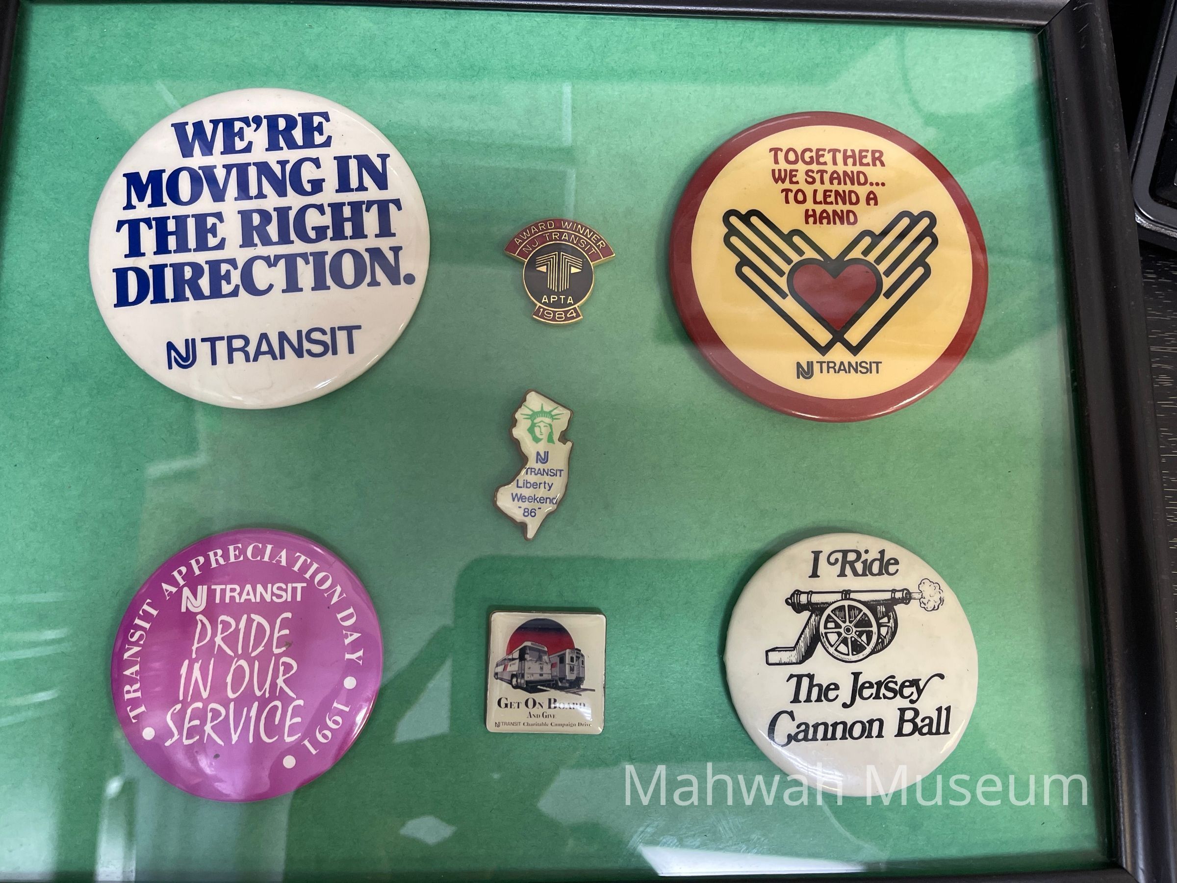 Seven different New Jersey (NJ) Transit pins used for advertisement from the 1980s