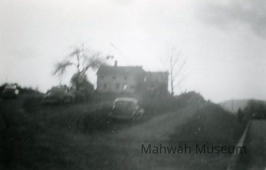 Photo of Hopper Homestead c 1952. Guard posts left side of home was height of Old Valley Road. Demolished in 1952 due to expansion of Rt 17. Hopper was grandfather of Francis H. Furman. Furman's mother, sister and himself were born in this house. Road going up the hill on the right side of car and home was the old Valley Road. The river bank on west side of home and old road was very very steep.Photograph Details