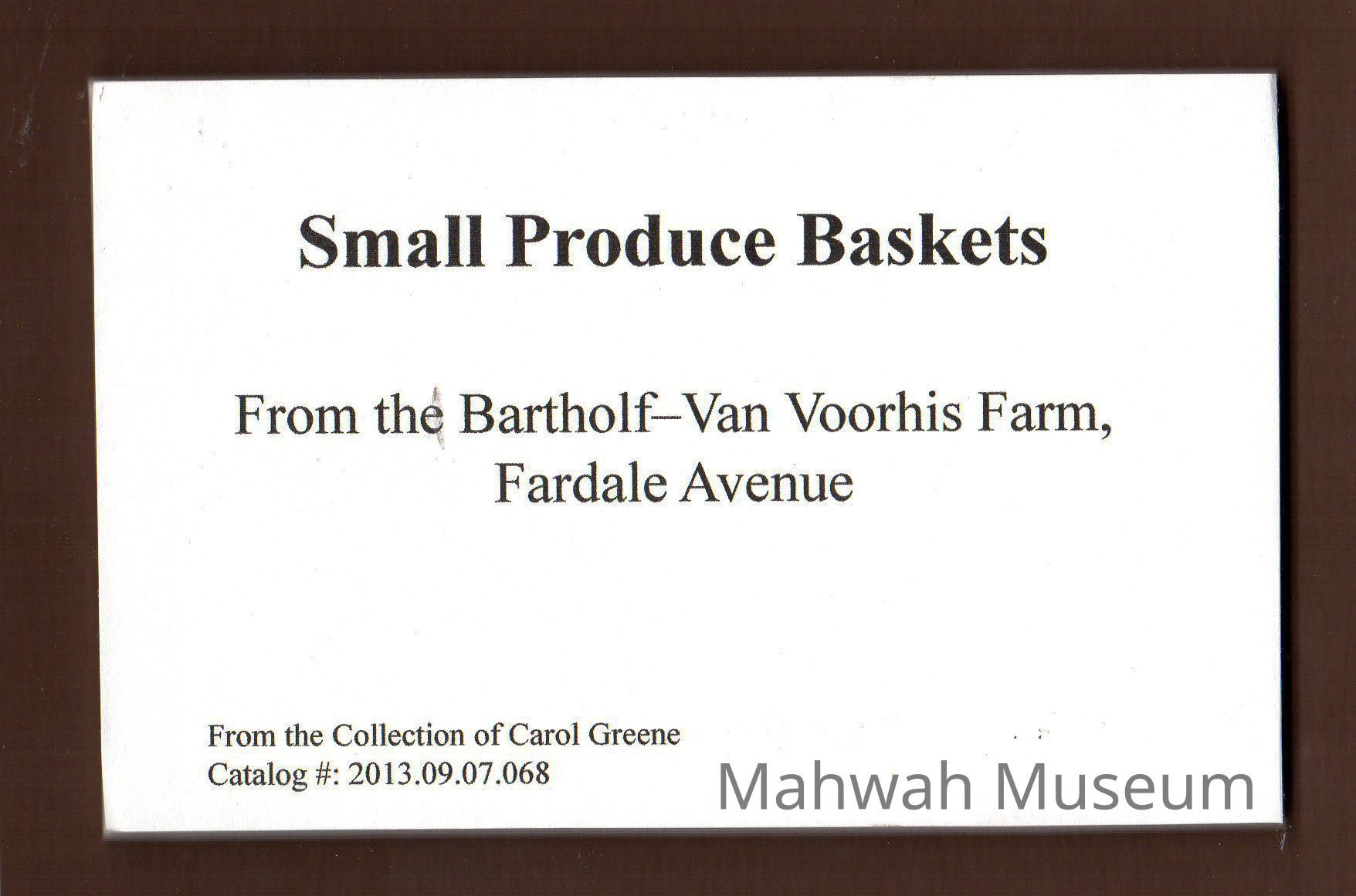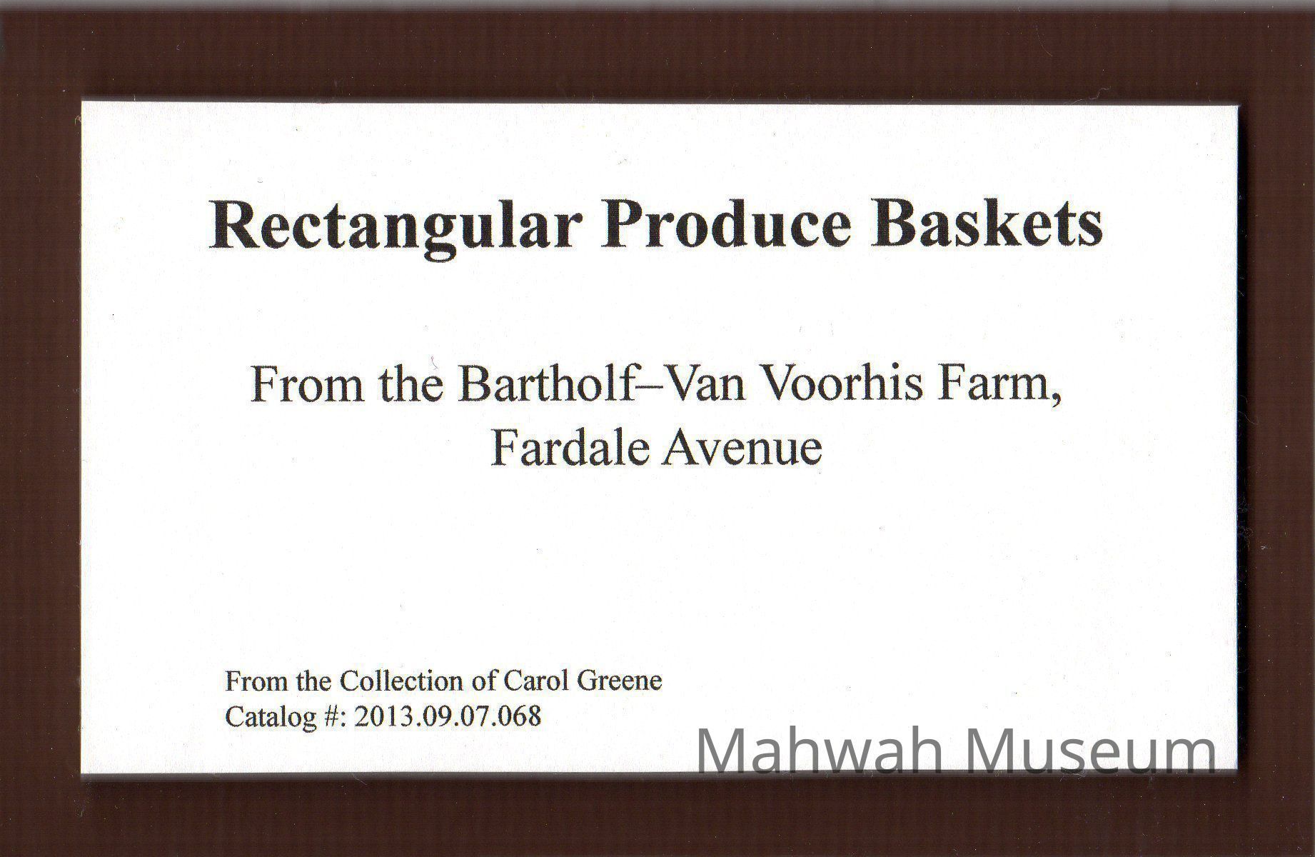 Paterson Jug from the Bartholf Van-Voorhis Farm. Contains captions Paterson Jug, Newark Jug, Rectangular Produce Baskets, and Small Produce Baskets.Collection