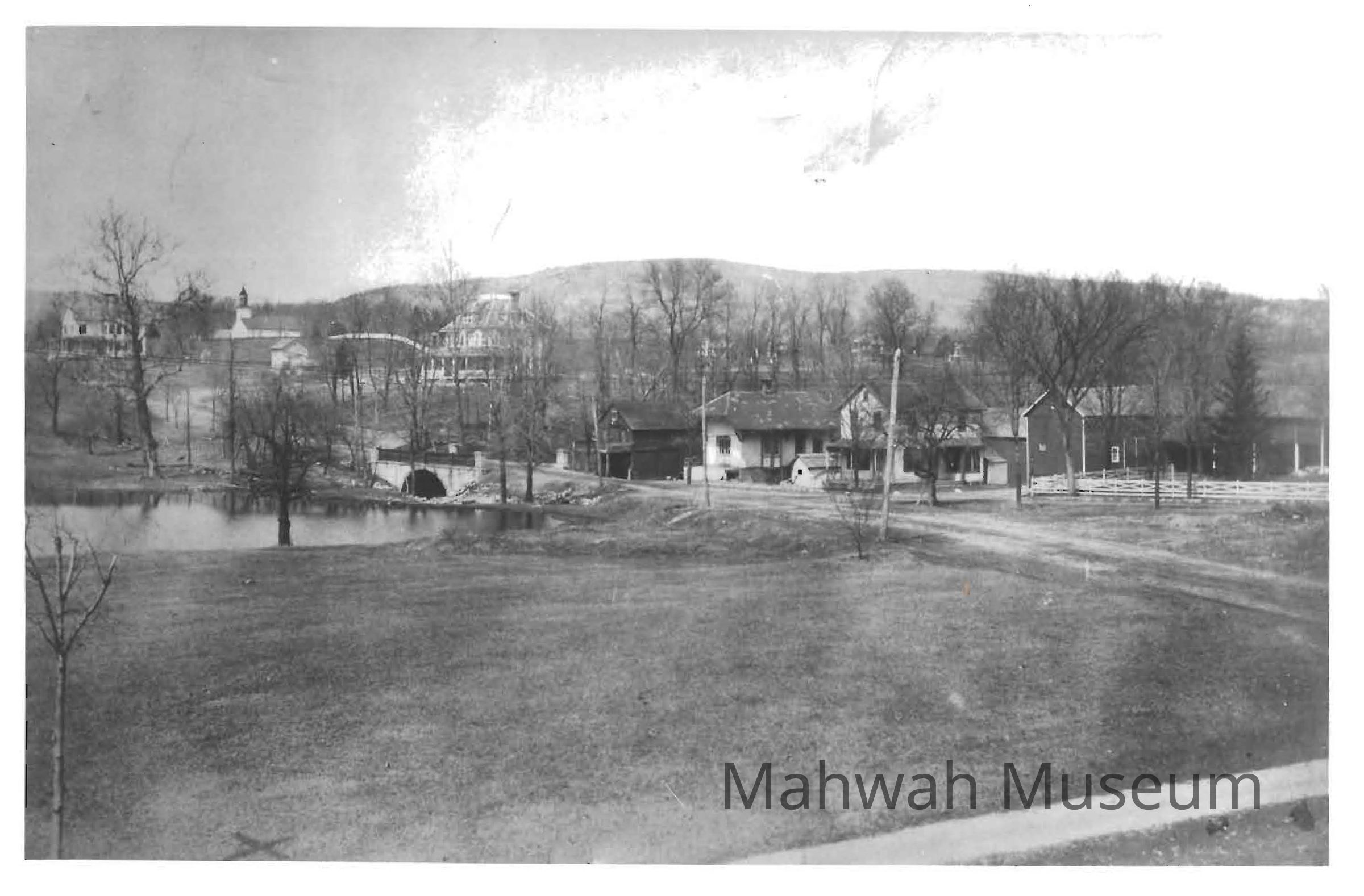 Black and white photograph of houses near Winter's Pond on West Ramapo Ave., with the Ramapo Reformed Church on the hill in the background (8x10). Shows 1871 train station before it became a museum. Collection of B. Zisgen.Photograph Details
