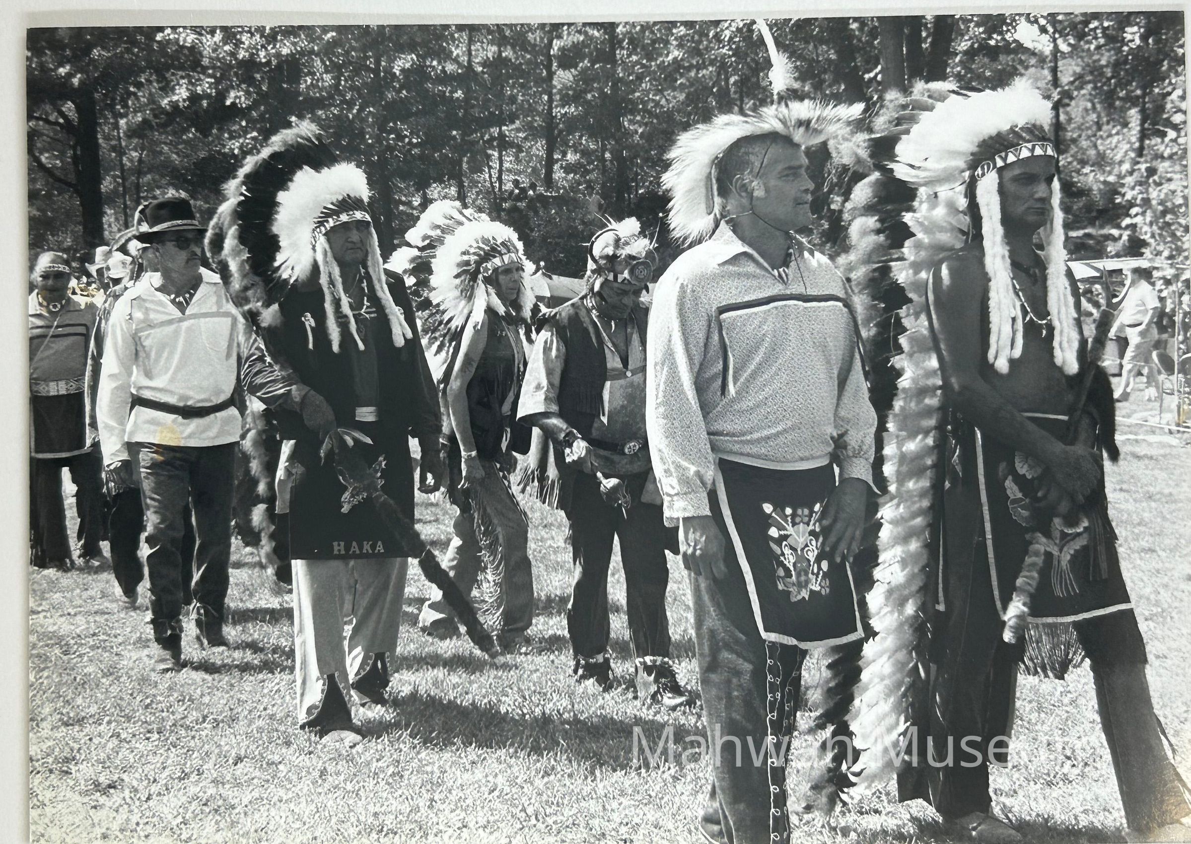 A photograph of the Ramapough Indian Pow Wow in Hillburn, New York. The photo was taken by Lee Vold on September 10th, 1983. From left to right: Sonny Pierce (Tribad Chairman; Nanticoke Leni Lenapi Tribe of South Jersey) Nick Van Dunk (Past Chief of Ramapough Mountain Indians) Grey Eagle Hoffman (Ramapough Mountain Indian) Donald "Brown Thrush" Delew (Medicine Man for the Ramapough Mountain Indians) Ronald Van Dunk (Chief, Ramapough Mountain Indians) Mac Van Dunk (Past chief, Ramapo Mountain Indians)