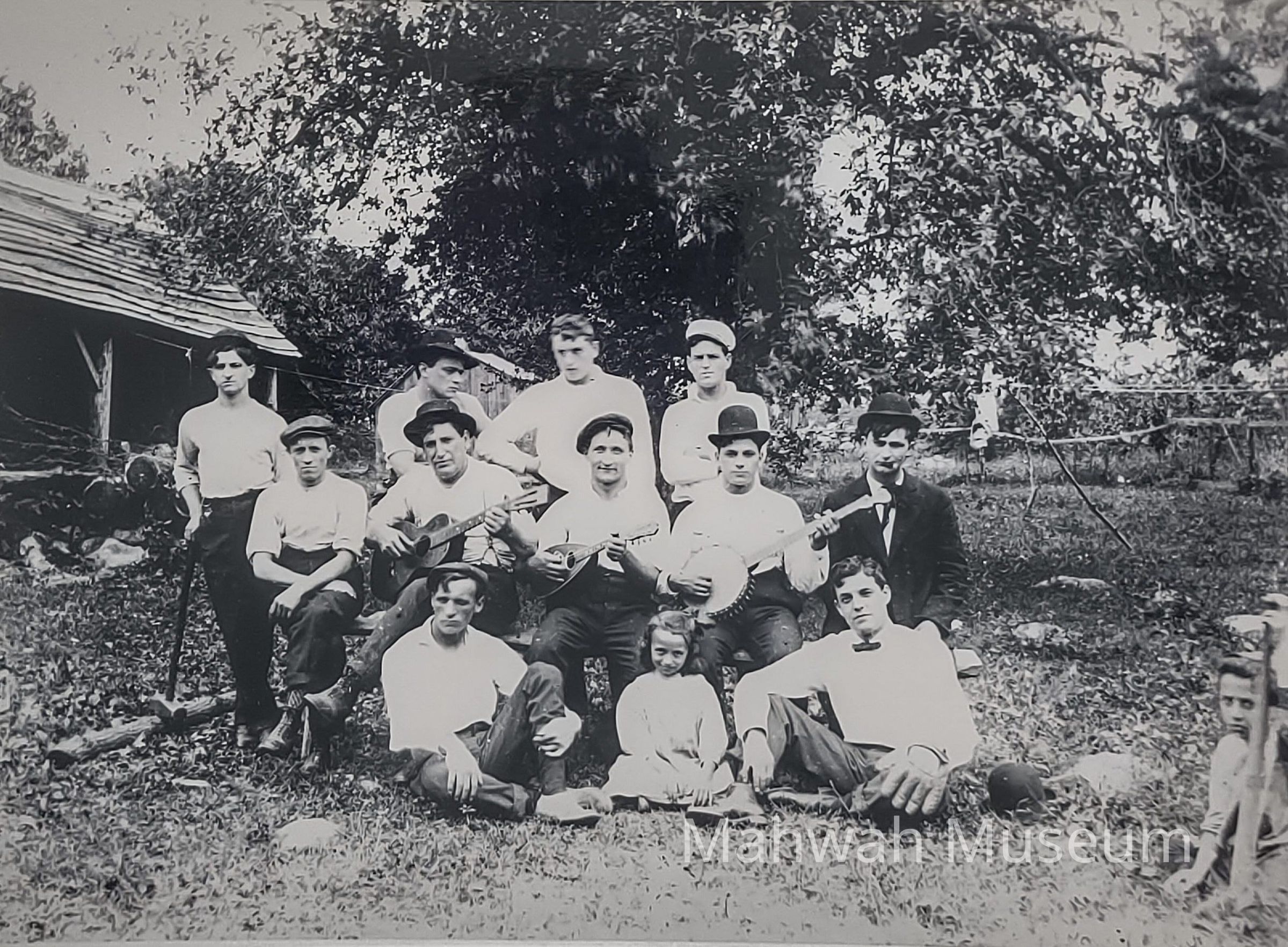 A group of Retaliate family members outside, with two playing string instruments.