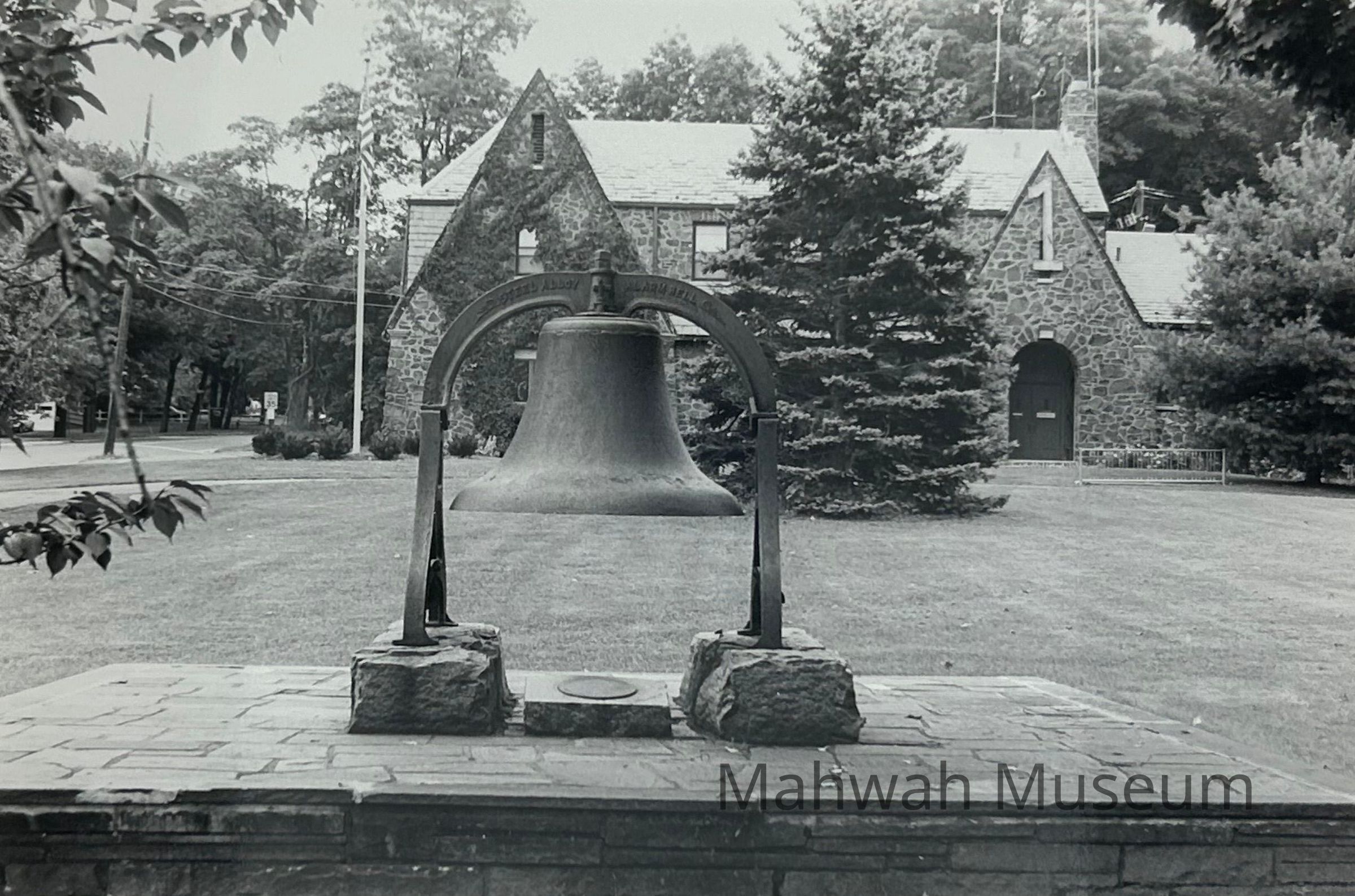 A photograph of "The Bell", which is now near the train station and post office. The Bell is pictured in front of Mahwah Fire Company #1.