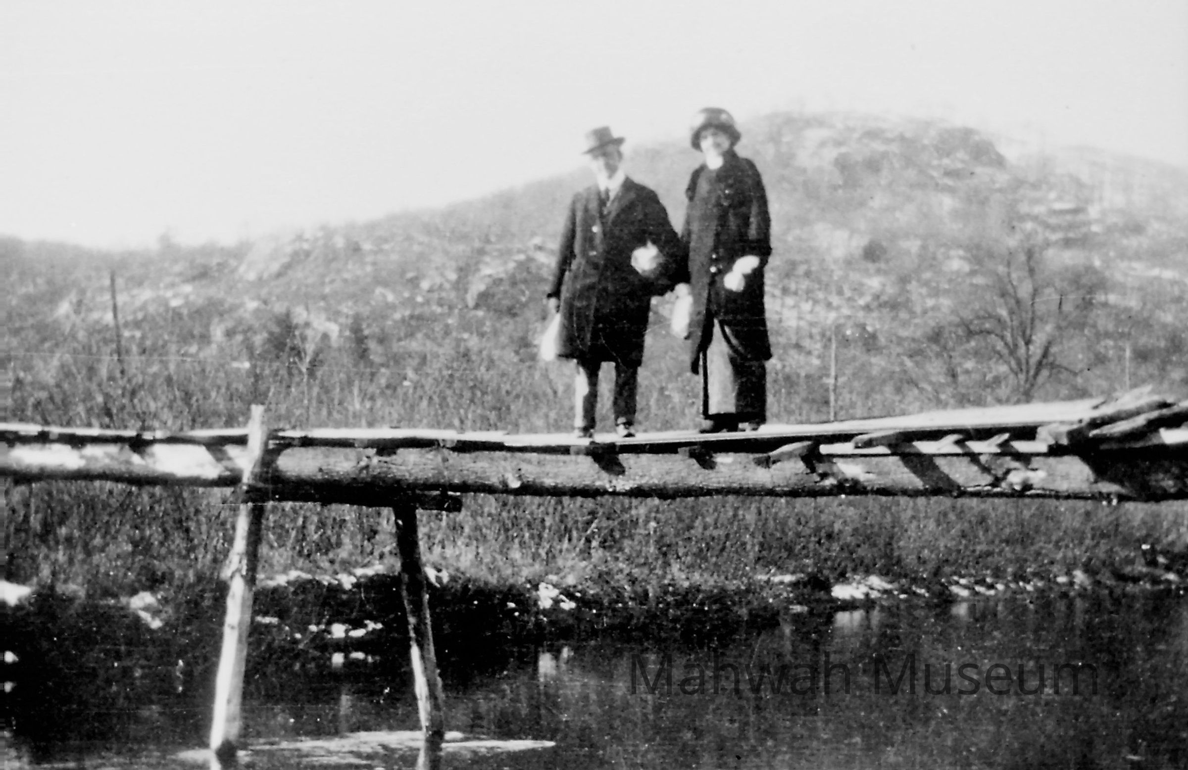 Two people on a wooden bridge