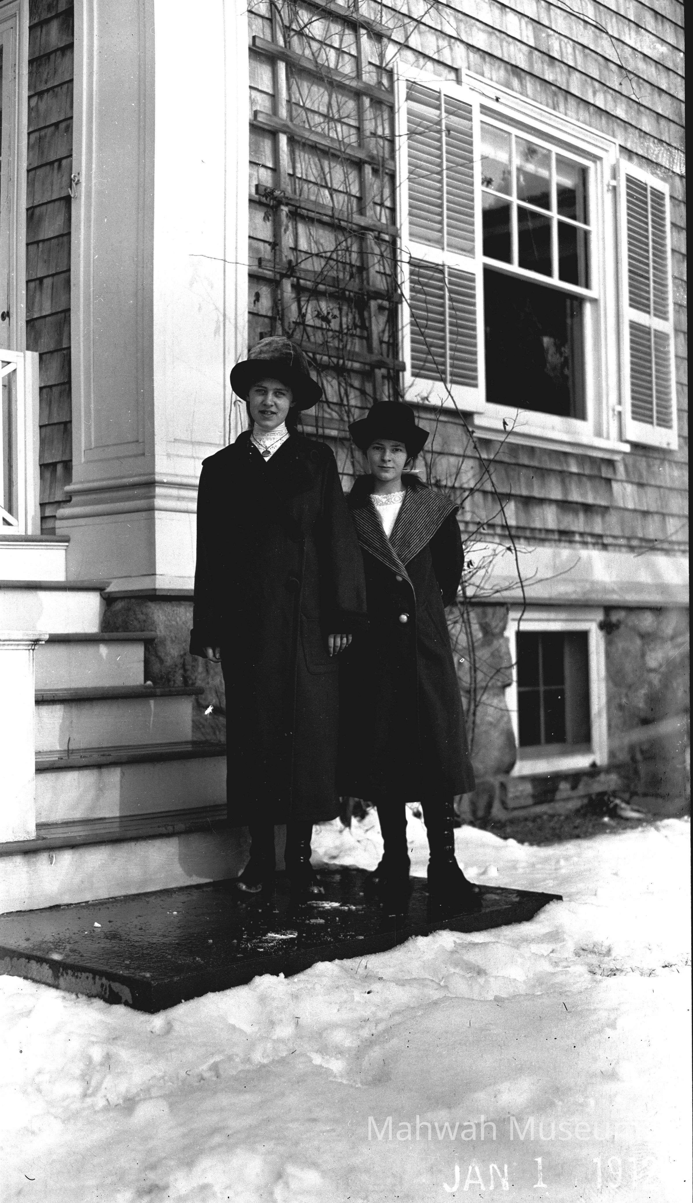 Two women in coats outside a shingled house.Photograph Details