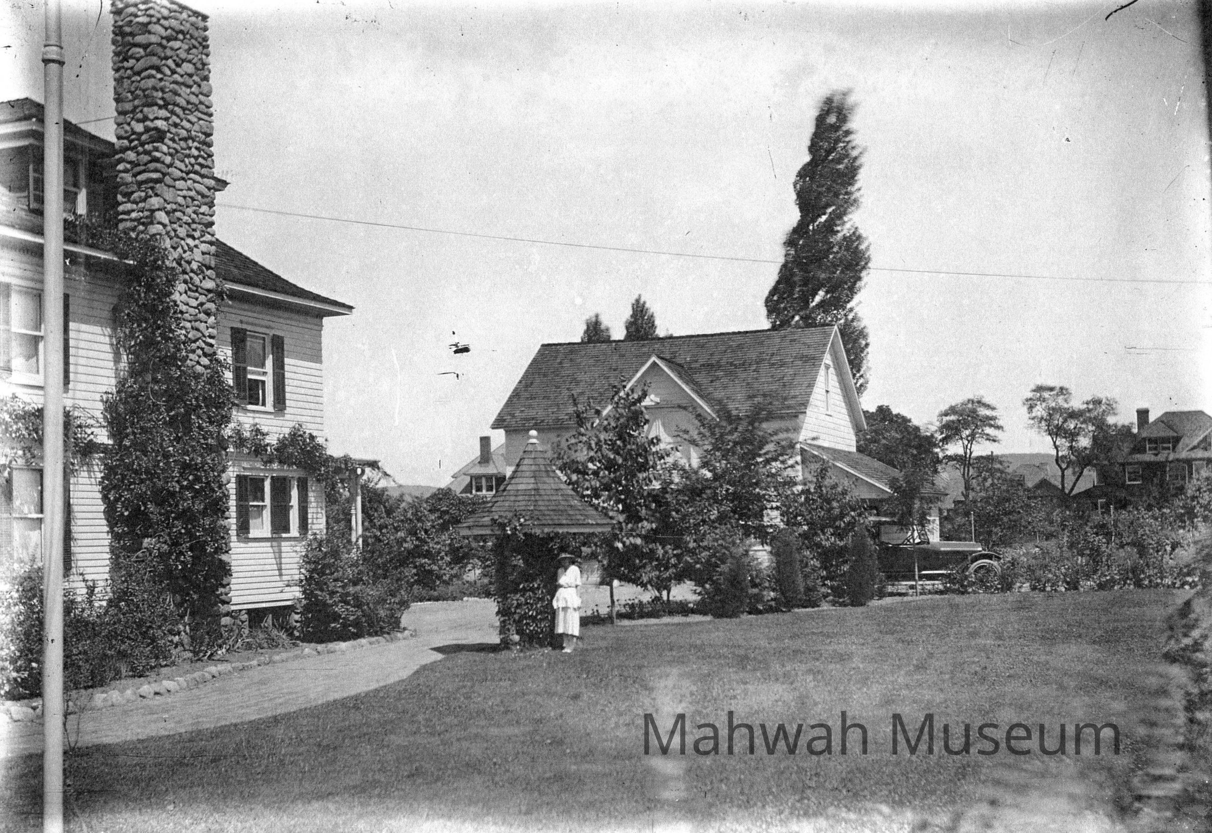 Twyford house, garage and Tiedermann house on right side of picture. Mrs. Elizabeth Twyford in garden.Photograph Details