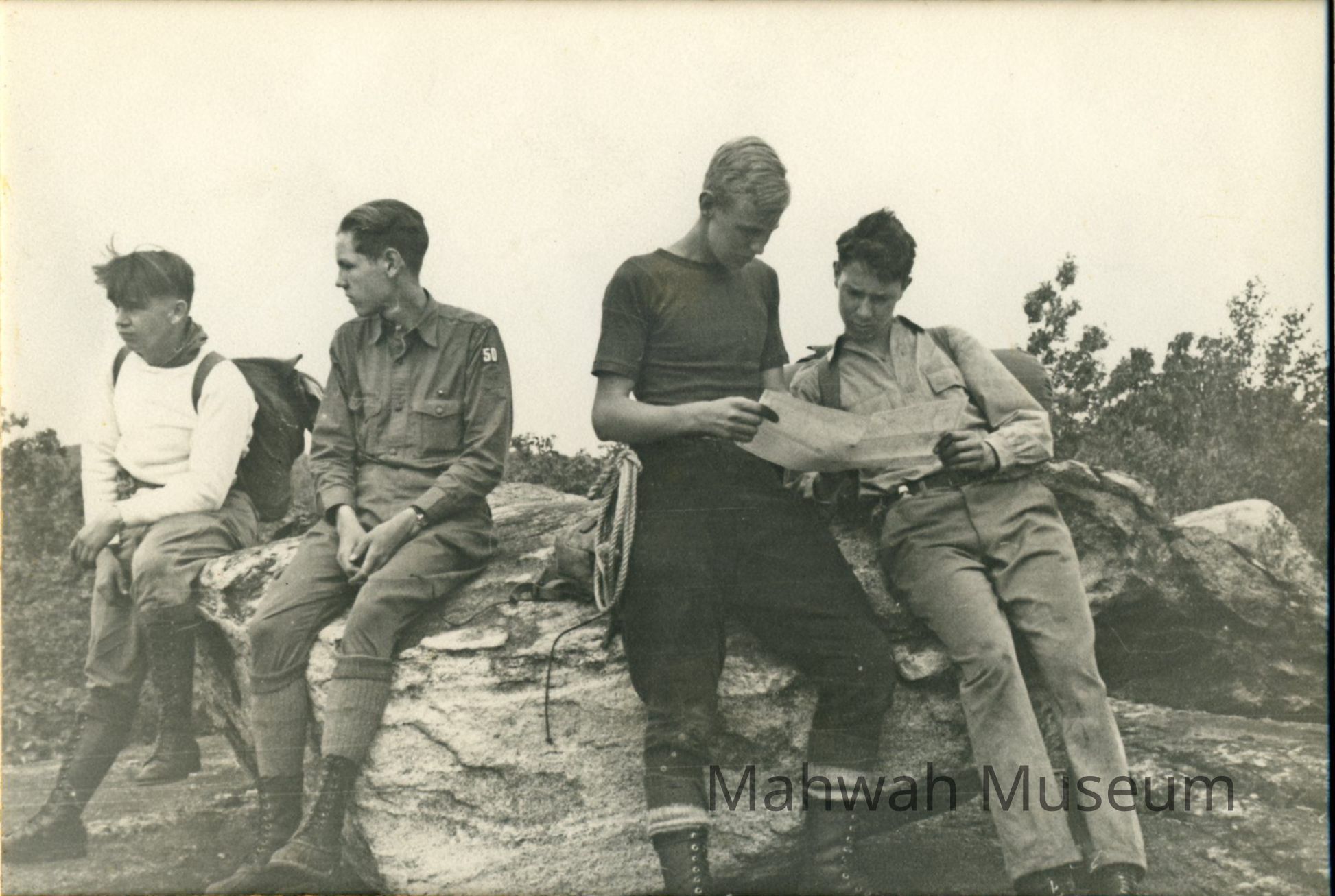 This is a photography of 4 Boy Scouts; James Hackett, future Mayor of Mahwah, Richard Sawtelle, Robert Frausen, future forest ranger and Albert Boursault Troop 50's first Eagle Scout. The picture depicts the four men sitting against a rock looking at a map. Below the photo is a caption reading "Which trail now?".Photograph Details