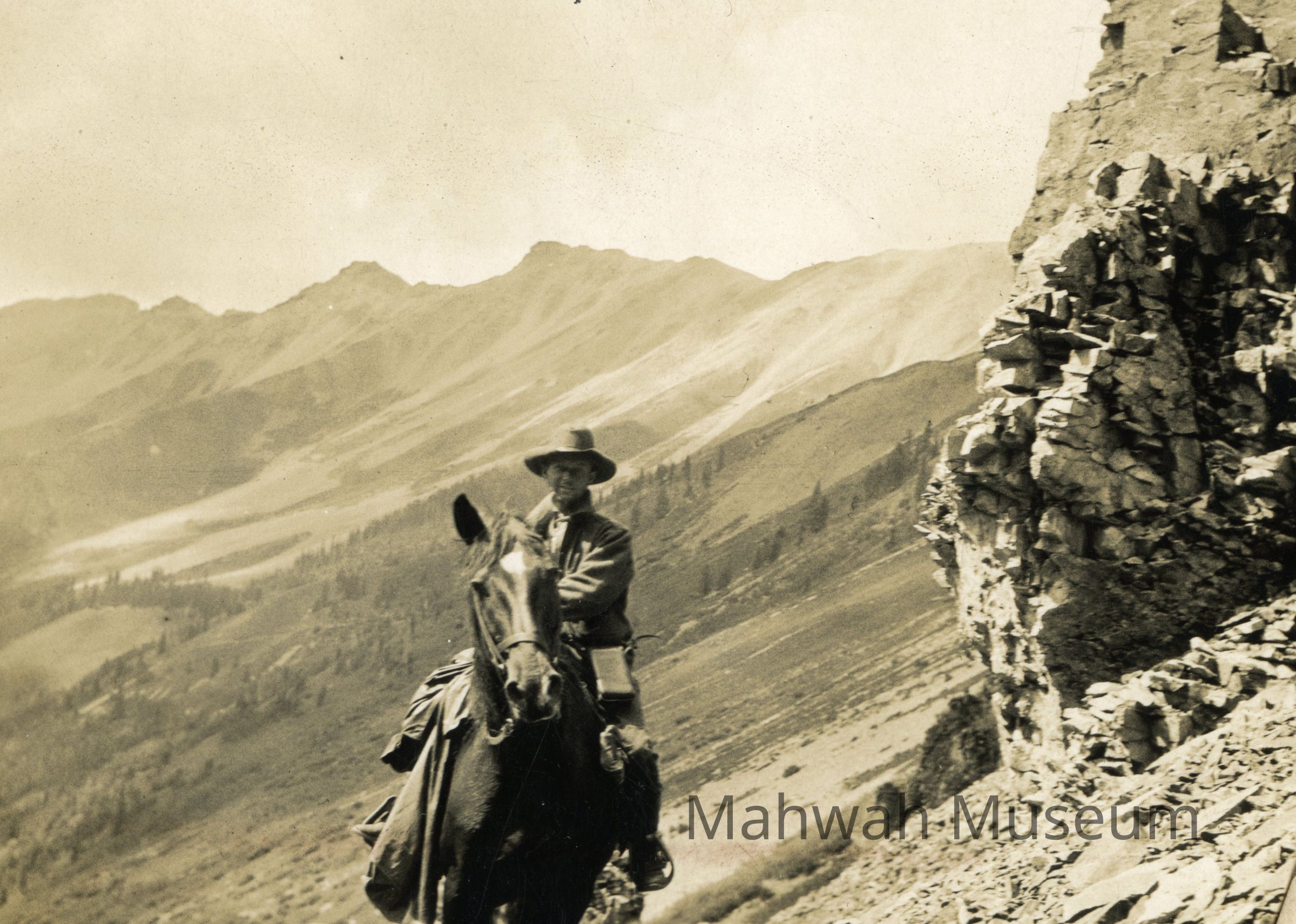 Unidentified member of the Young family rides a horse with mountains in the distance.Photograph Details