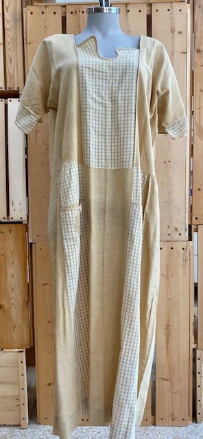 Beige cotton dress with beige white check down front and on each side of front skirt. Two small pockets. Short sleeves trimmed with check. Was Mrs. Wm. Sampson's (Maggie Morrison) - mother of the late Mrs. Olga Adams from Bagot, Manitoba.Cataloged By