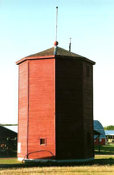 When rail lines were constructed through Manitoba, the railways had to construct water towers along the lines as steam locomotives needed water on a regular basis. These tanks were constructed at regular intervals along rail lines These towers held about 40,000 gallons (about 180,000 litres) of water and would enable the locomotives to fill quickly and frequently.