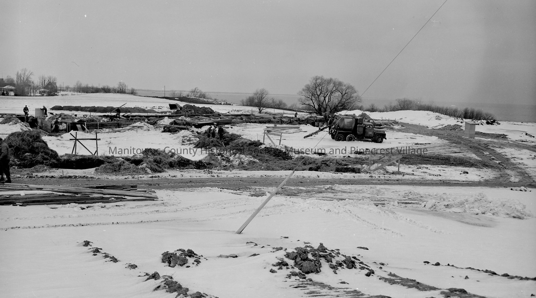 UW-Manitowoc, 705 Viebahn Street, foundation work looking east. Photograph taken on December 19th, 1961.