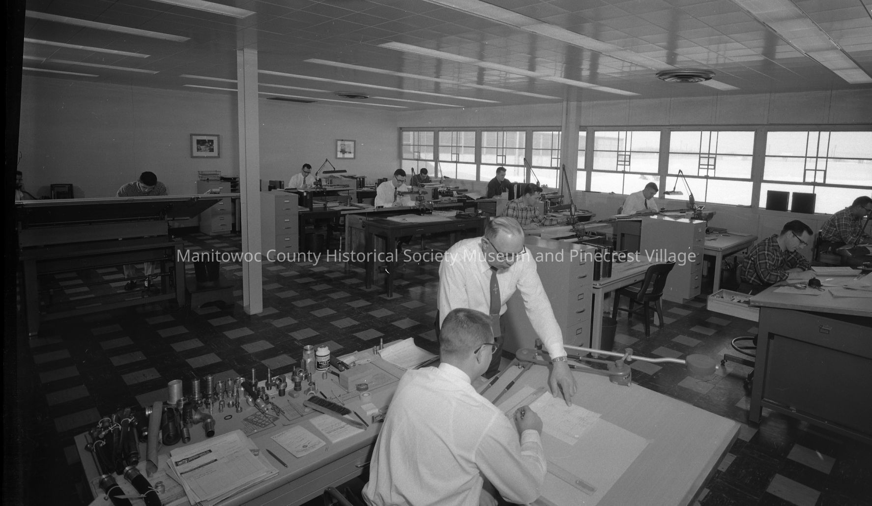 Manitowoc Engineering department, Eastman's Mfg. at 1440 North 24th Street Manitowoc. Photograph taken on January 26th, 1957.Made/Created