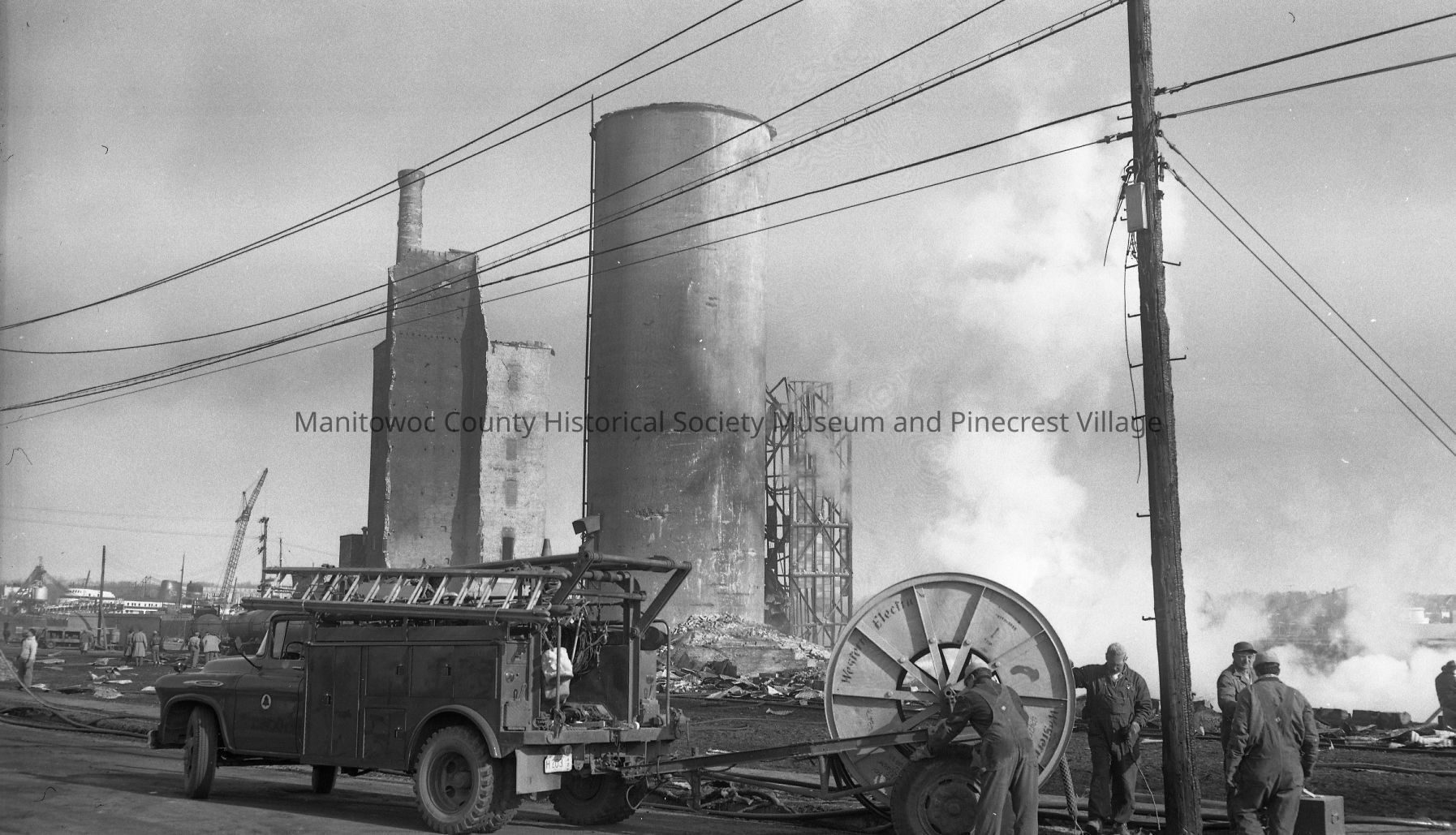 Elevator B fire on South Water Street Manitowoc. This is aftermath looking from South Water Street. Utility crews starting to replace wires. Photograph taken on March 27th, 1962.Made/Created