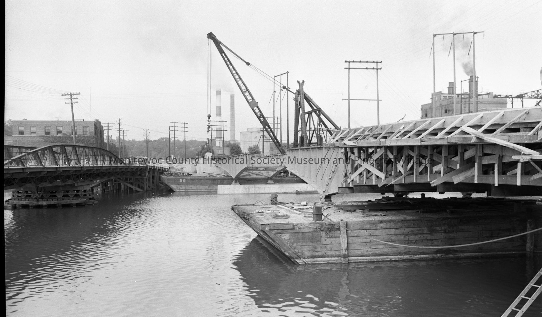 Section of new 21st Street bridge Manitowoc on barge; old bridge at left which was originally the 10th Street swing bridge in Manitowoc. Photograph taken on August 16th, 1951.Made/Created