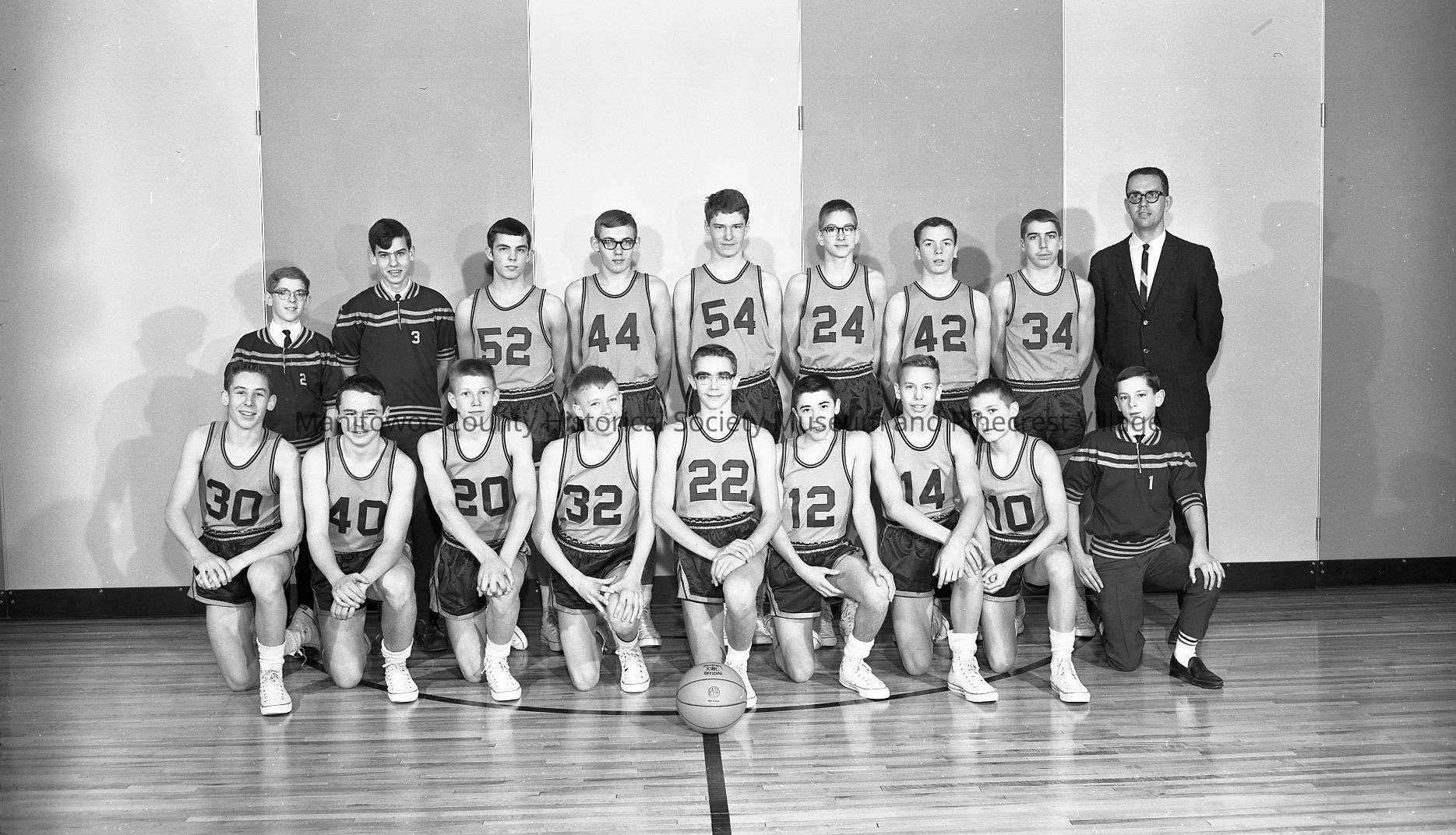 Roncalli High School Basketball Team: Front: T. Dodge, J. Backus, L. Paulow, S. Menchal, G. Kostechka, N. Brazzale, G. Scheuer, B. Dufek, D. Naidl. 2nd row: F. Backnecht, B. Pfeffer, J. Stueck, G. Kubichka, B. Granger, B. Censky, M. Ostertag, M. Dowd, Coach James Kersten.