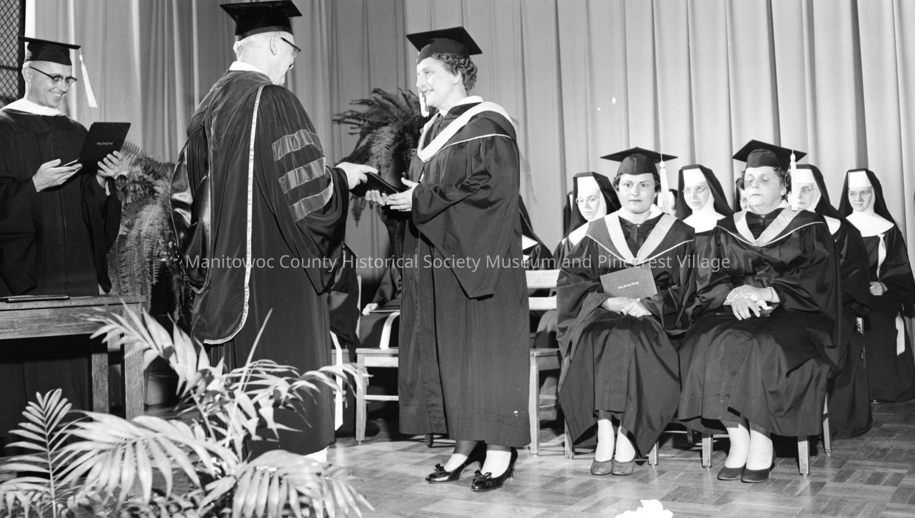 Graduating Class of 1960 receiving diplomas at Silver Lake college 2406 South Alverno Road. Photograph taken on July 28th, 1960.
