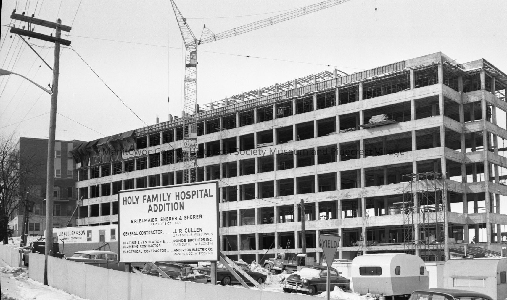 Progress on new east wing of Holy Family Hospital looking from South 21st Street. Photograph taken on January 1st, 1965.