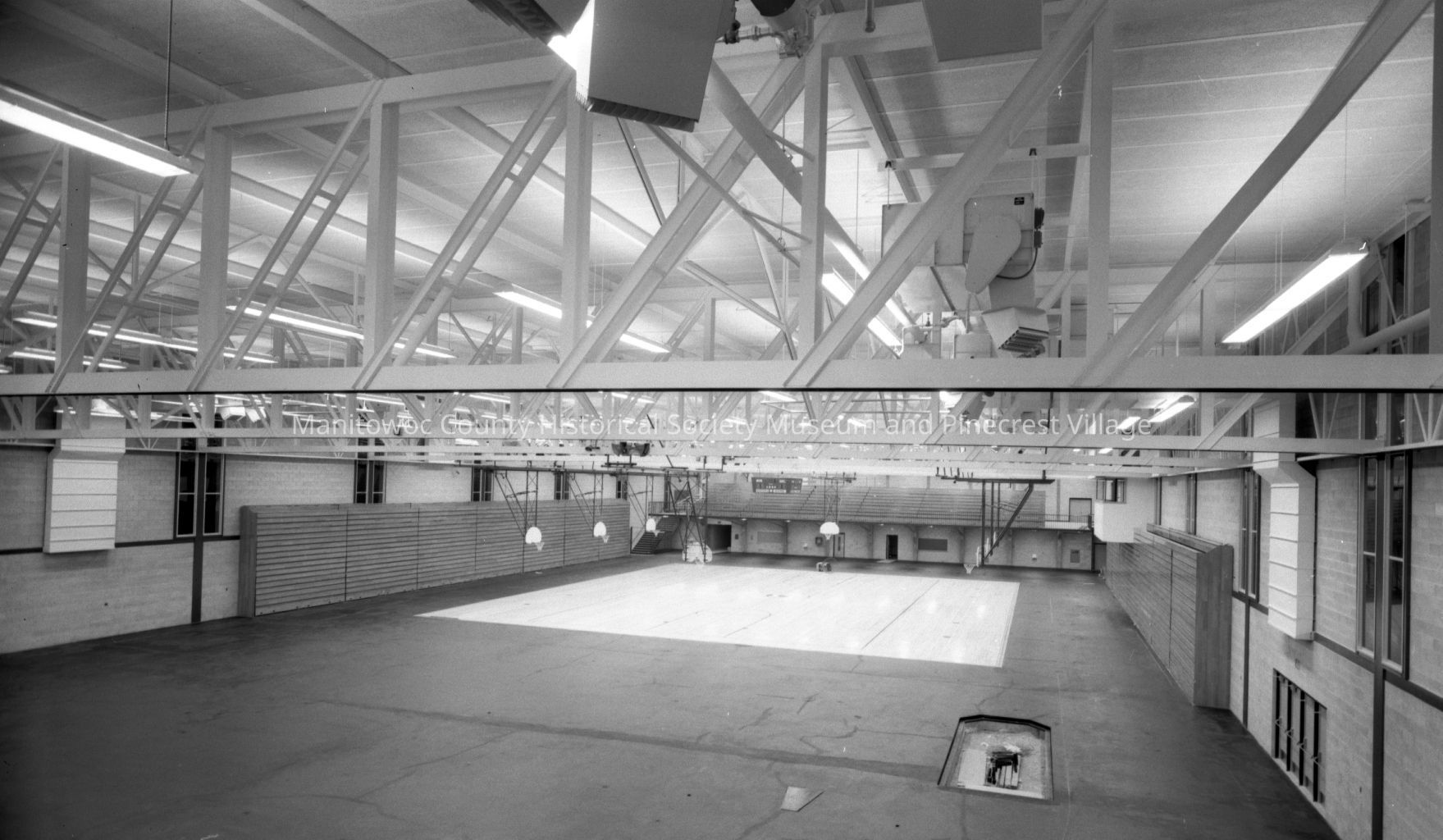 Lincoln High School, South 8th Street Manitowoc, interior of new gym looking east at rear and balcony with bleachers extended. Small rectangle at lower right is long jump pit. Photograph taken on November 28th, 1961.Made/Created