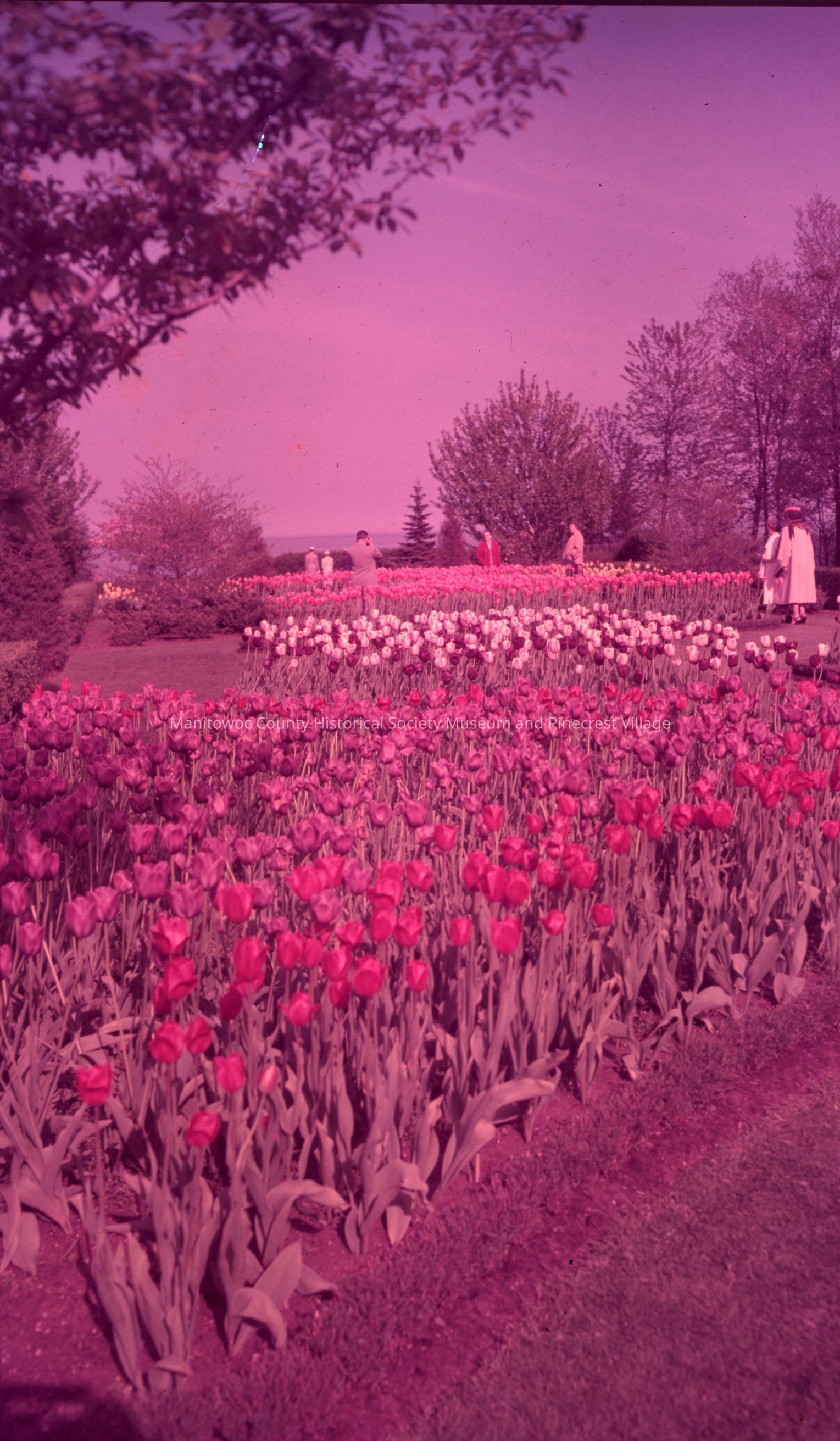 Aerial of Ruth West tulip gardens at 915 Memorial Drive Manitowoc. Circa 1957.