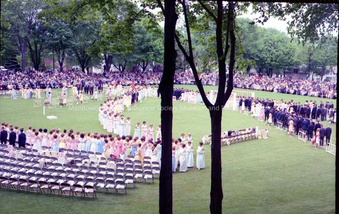Lincoln High School, South 8th Street Manitowoc, seniors headed for seats while invited guests watch from bleachers. Photograph taken on June 7th, 1966.Made/Created
