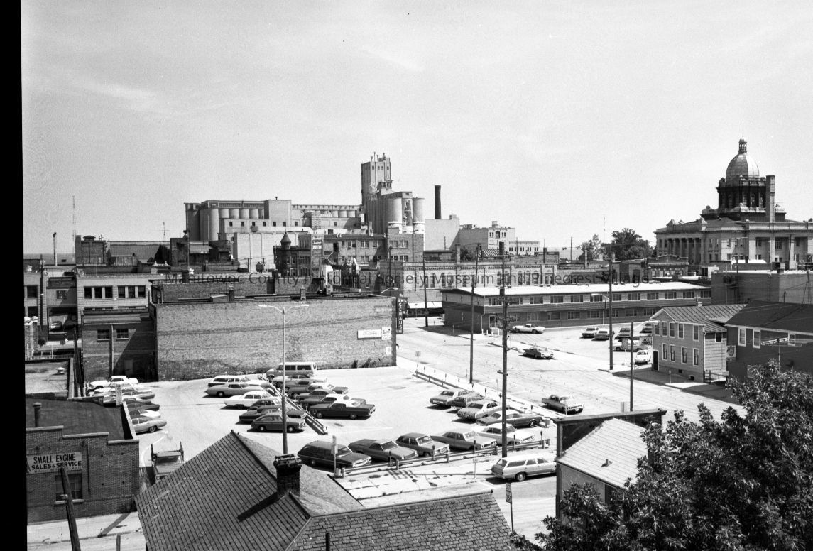 Birds-eye from 1011 Franklin Street Manitowoc looking southeast at Jay Street. Right is Koral's Bar, 921 South 10th; 917 Jay; parking lot and backside of Guest House Inn, 908 Washington; and Napp Office Supply, 823 Jay Street. At left is Schaus Hardware, 912 Jay; building complex in background is the Anheuser-Busch Malt house. Photograph taken on August 16th, 1976.Made/Created