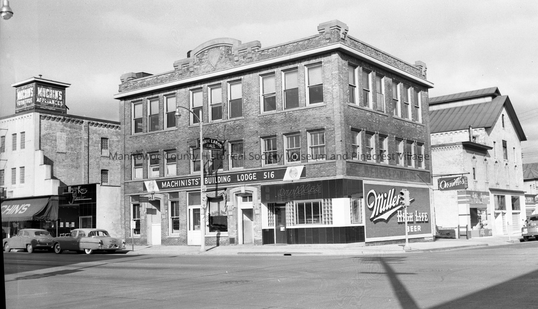Machinist's Union Buillding and Orville's Bar, 1000 Washington Street Manitowoc. Also in building is Goodhew Barbershop,1002; Muchin Attornies, 1004; at left is Kurtz Jewelry, 1008; and Muchin Furniture, 1010 Washington Street. At right is Spic & Span Cleaners, 936; and Manitowoc Youth Center, 934 South 10th Street. Photograph taken on October 31st, 1951.Made/Created