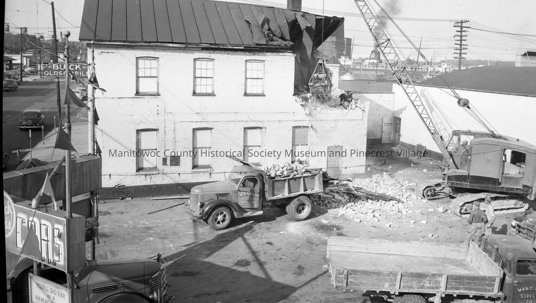 Old Wilda & Fricke Battery Company, 818 Franklin Street Manitowoc being torn down. Circa 1950.