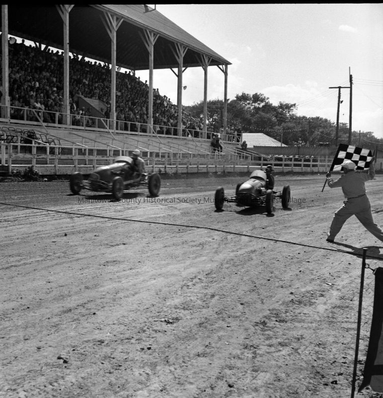 Manitowoc County Fair; open-wheel auto race. Photograph taken in August 1953.