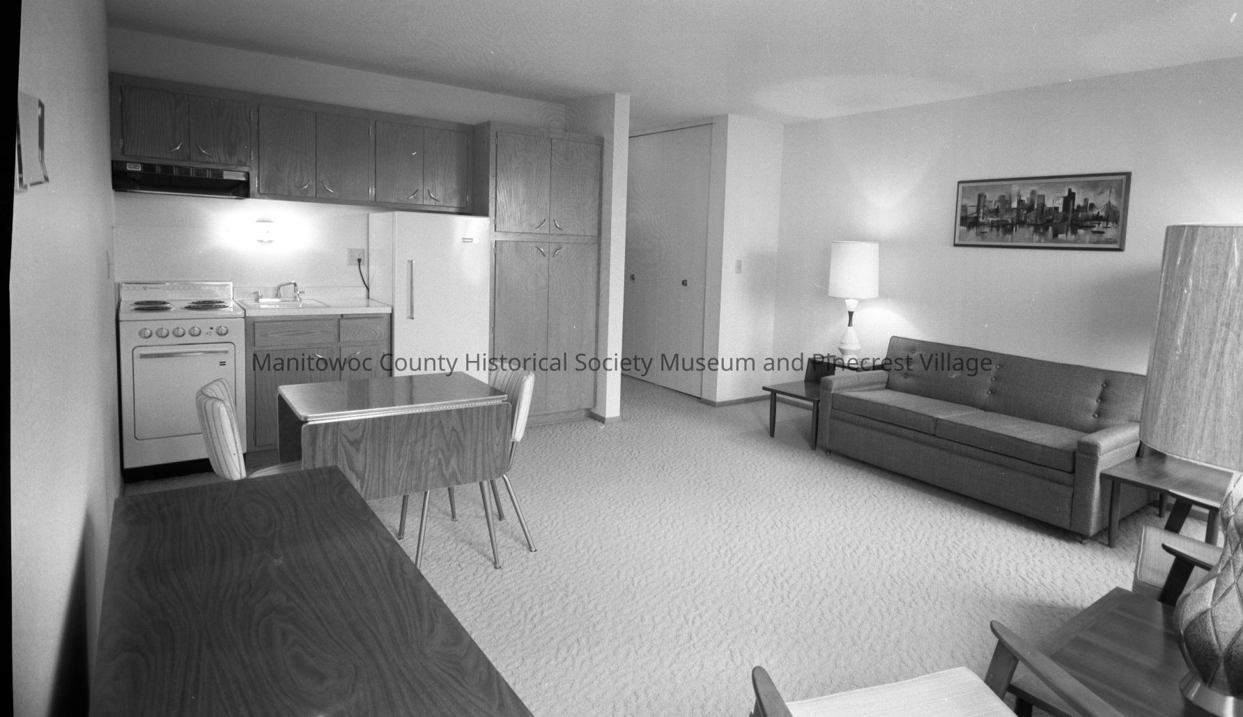 Living room, kitchen combo in apartment at 820 Reed Ave Manitowoc. Photograph taken on September 6th, 1964.